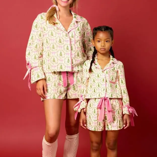 Mom and Daughter Matching Christmas Pajamas Set Full Print Button Up Lapel V Neck Long Sleeve Tops and Shorts Mom Size (cm) S Tops Length: 52 Bust: 104 Shoulder: 44 Sleeve: 57 Pants Length: 34 Waist: 64 Hip: 108 M Tops Length: 53 Bust: 108 Shoulder: 45 Sleeve: 58 Pants Length: 35 Waist: 68 Hip: 112 L Tops Length: 54 Bust: 114 Shoulder: 46.5 Sleeve: 59 Pants Length: 36 Waist: 74 Hip: 118 XL Tops Length: 55 Bust: 120 Shoulder: 48 Sleeve: 60 Pants Length: 37 Waist: 80 Hip: 124 XXL Tops Length: 56 Bust: 126 Shoulder: 49.5 Sleeve: 61 Pants Length: 37.5 Waist: 86 Hip: 130 Mom Size (inch) S Tops Length: 20.47 Bust: 40.94 Shoulder: 17.32 Sleeve: 22.44 Pants Length: 13.39 Waist: 25.20 Hip: 42.52 M Tops Length: 20.87 Bust: 42.52 Shoulder: 17.72 Sleeve: 22.83 Pants Length: 13.78 Waist: 26.77 Hip: 44.09 L Tops Length: 21.26 Bust: 44.88 Shoulder: 18.31 Sleeve: 23.23 Pants Length: 14.17 Waist: 29.13 Hip: 46.46 XL Tops Length: 21.65 Bust: 47.24 Shoulder: 18.90 Sleeve: 23.62 Pants Length: 14.57 Waist: 31.50 Hip: 48.82 XXL Tops Length: 22.05 Bust: 49.61 Shoulder: 19.49 Sleeve: 24.02 Pants Length: 14.76 Waist: 33.86 Hip: 51.18 Daughter Size (cm): 3T Tops Length: 37.5 Bust: 68 Shoulder: 28 Sleeve Length: 31 Pants Length: 24.5 Waist: 44 Hip: 70 Advised Age: 3 Years 4T Tops Length: 38 Bust: 71 Shoulder: 29 Sleeve Length: 33 Pants Length: 26 Waist: 46 Hip: 73 Advised Age: 4 Years 5T Tops Length: 39.5 Bust: 74 Shoulder: 30.25 Sleeve Length: 35.5 Pants Length: 27.5 Waist: 48 Hip: 76 Advised Age: 5 Years 6T Tops Length: 41 Bust: 77 Shoulder: 31.5 Sleeve Length: 38 Pants Length: 29 Waist: 50 Hip: 79 Advised Age: 6 Years 8T Tops Length: 44 Bust: 83 Shoulder: 34 Sleeve Length: 43 Pants Length: 32 Waist: 54 Hip: 85 Advised Age: 8 Years 10T Tops Length: 47 Bust: 89 Shoulder: 36.5 Sleeve Length: 48 Pants Length: 35 Waist: 58 Hip: 91 Advised Age: 10 Years 12T Tops Length: 50 Bust: 95 Shoulder: 39 Sleeve Length: 53 Pants Length: 38 Waist: 62 Hip: 97 Advised Age: 12 Years Daughter Size (inch): 3T Tops Length: 14.76 Bust: 26.77 Shoulder: 11.02 Sleeve Length: 12.2 Pants Length: 9.65 Waist: 17.32 Hip: 27.56 Advised Age: 3 Years 4T Tops Length: 14.96 Bust: 27.95 Shoulder: 11.42 Sleeve Length: 12.99 Pants Length: 10.24 Waist: 18.11 Hip: 28.74 Advised Age: 4 Years 5T Tops Length: 15.55 Bust: 29.13 Shoulder: 11.91 Sleeve Length: 13.98 Pants Length: 10.83 Waist: 18.9 Hip: 29.92 Advised Age: 5 Years 6T Tops Length: 16.14 Bust: 30.31 Shoulder: 12.4 Sleeve Length: 14.96 Pants Length: 11.42 Waist: 19.69 Hip: 31.1 Advised Age: 6 Years 8T Tops Length: 17.32 Bust: 32.68 Shoulder: 13.39 Sleeve Length: 16.93 Pants Length: 12.6 Waist: 21.26 Hip: 33.46 Advised Age: 8 Years 10T Tops Length: 18.5 Bust: 35.04 Shoulder: 14.37 Sleeve Length: 18.9 Pants Length: 13.78 Waist: 22.83 Hip: 35.83 Advised Age: 10 Years 12T Tops Length: 19.69 Bust: 37.4 Shoulder: 15.35 Sleeve Length: 20.87 Pants Length: 14.96 Waist: 24.41 Hip: 38.19 Advised Age: 12 Years Material: 95% Polyester and 5% Elastane Size: Mom: S/M/L/XL/XXL; Daughter: 3 Years/4 Years/5 Years/6 Years/8 Years/10 Years/12 Years 1 Pajamas Set(1 Tops, 1 Pair of Shorts) 1. Due to manual measurement, there may be small errors in size. 2. Depending on the computer monitor used, colors may a little different from actual colors. If the product has any quality problems, please let us know and we will help you solve it as soon as possible.