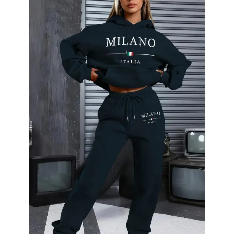 1set Milano Italy Theme Women's Casual Sweatshirt and Sweatpants Set - Long Sleeve Pullover with Hood, Cartoon Print, Polyester Knit Fabric, Pockets - For Autumn/Winter - for Women - Cozy and Stylish LoungewearGift