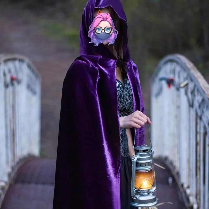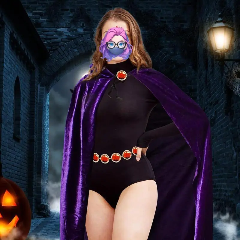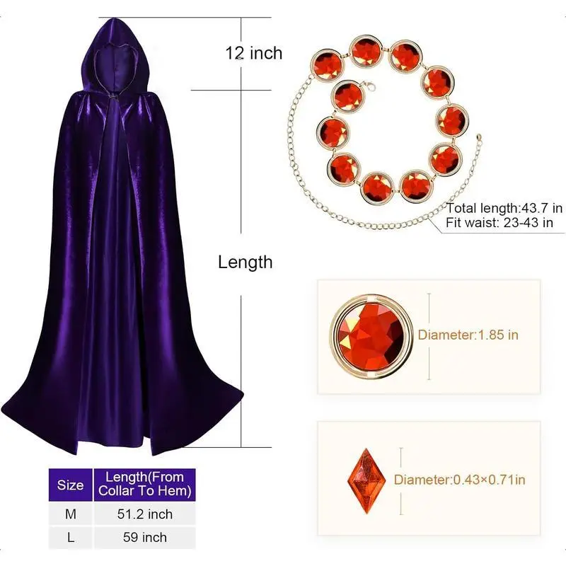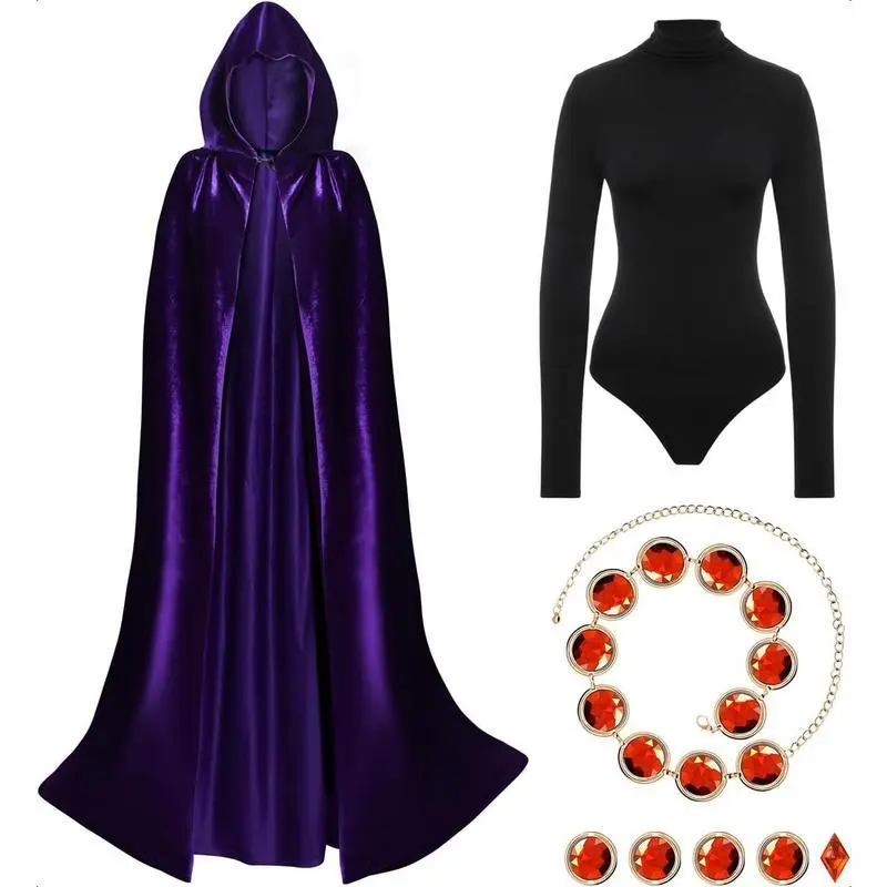 Women's Halloween Cosplay Costume Purple Hooded Cloak Cape Long Sleeve Bodysuits with Adjustable Red Gem Waist Belt