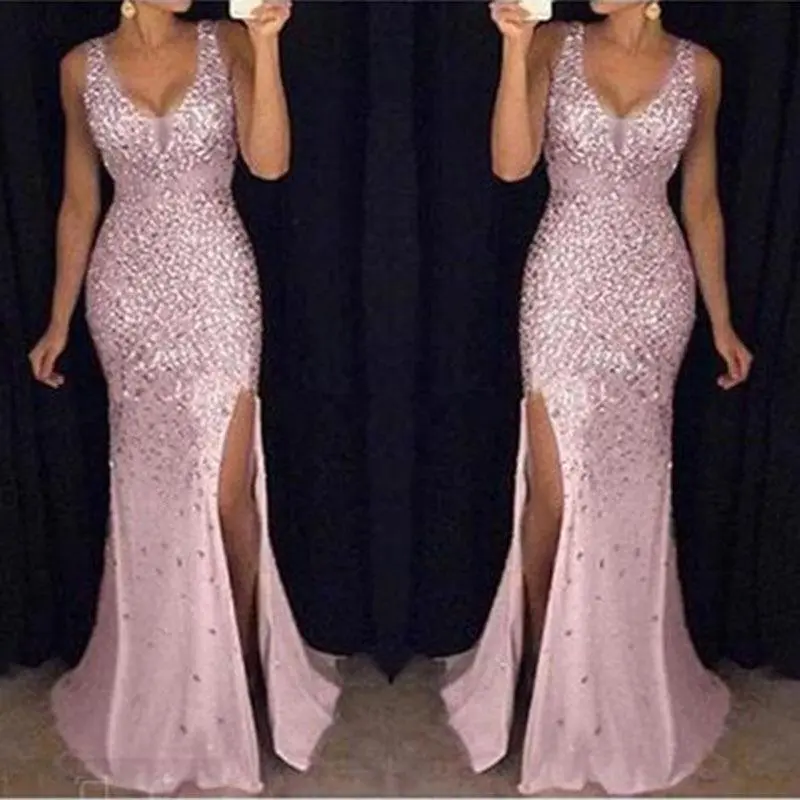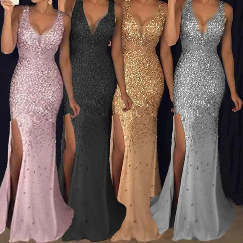 2025Women'sFashionLongDressSpaghettiStrapV-neckSlitGoldSequinGownDressFormalWomenswear