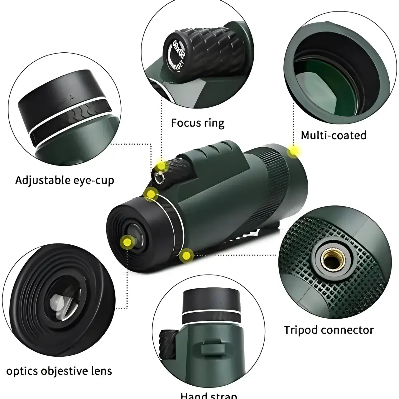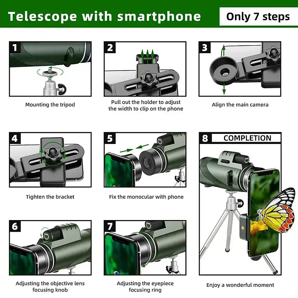 【High magnification】: Features an 80x magnification, making distant objects appear remarkably close and detailed for optimal viewing experiences. 【FMC coating】: Includes FMC multi-layer broadband coating, enhancing light transmission and image brightness for clear visuals even in low light. 【Compact design】: The lightweight and portable structure ensures ease of transport, suitable for various outdoor activities like concerts and travel. 【Smartphone compatibility】: Designed for easy attachment to smartphones, enabling users to capture high-quality images and videos conveniently. 【Single tube structure】: The single tube design simplifies usage and enhances sturdiness, providing a reliable and user-friendly experience.