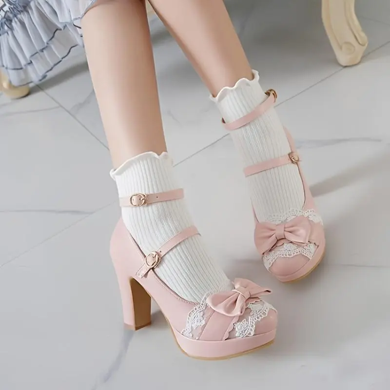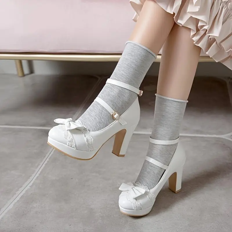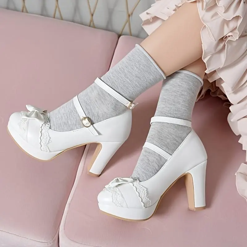 CharmingPinkMaryJaneHighHeelswithBowTie&LaceDetail,ComfortableThickSole,RoundToe,IdealforParties&Work,All-SeasonWearElegantShoeWomenGirlPlatformSandalsWhite