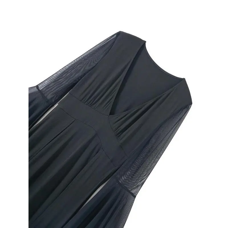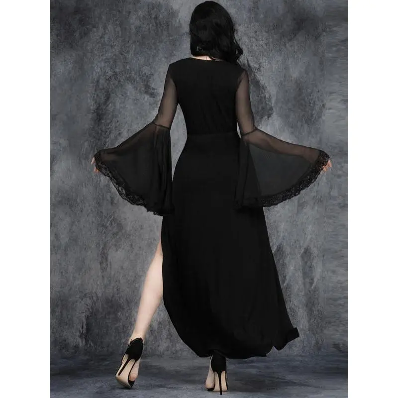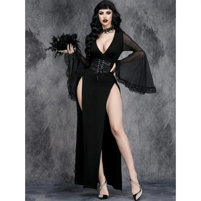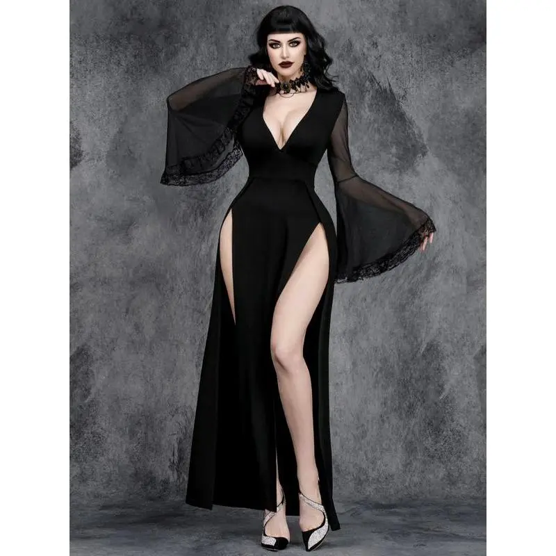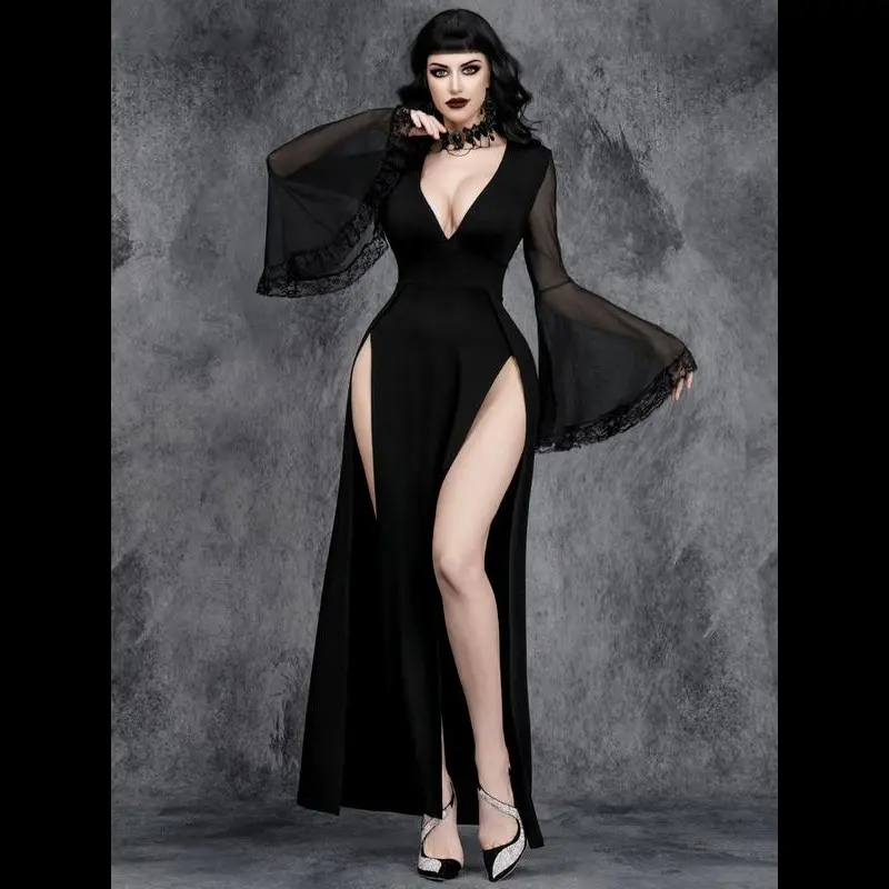 ??Deep V-Neck??: The prominent deep V-neckline offers a bold silhouette, setting this dress apart in the goth fashion category. ??Sheer Mesh Inserts??: Featuring delicate mesh insertions, this dress adds an intriguing layered effect, enhancing its dark gothic aesthetic. ??Side Slits??: The stylish side slits provide ease of movement while adding a subtle edge to the dress's overall appearance. ??Moderate Fabric Weight??: Crafted from moderately thick fabric, this dress is suitable for wear across all seasons, balancing warmth and breathability. ??Fitted Silhouette??: Designed with a fitted cut, it accentuates the body's shape while ensuring a flattering look that complements various body types.