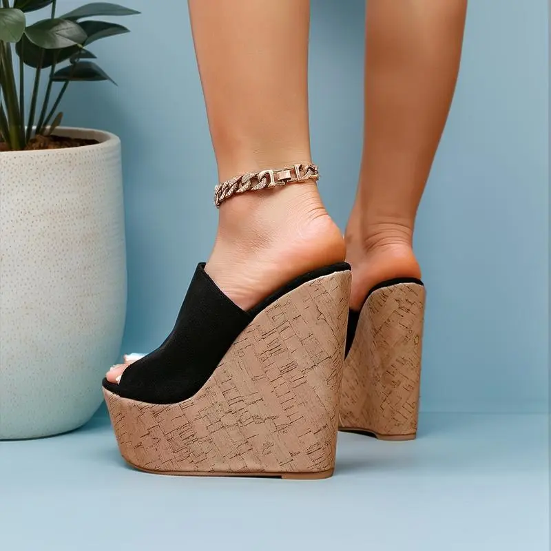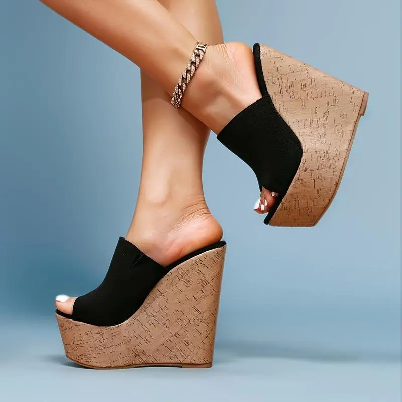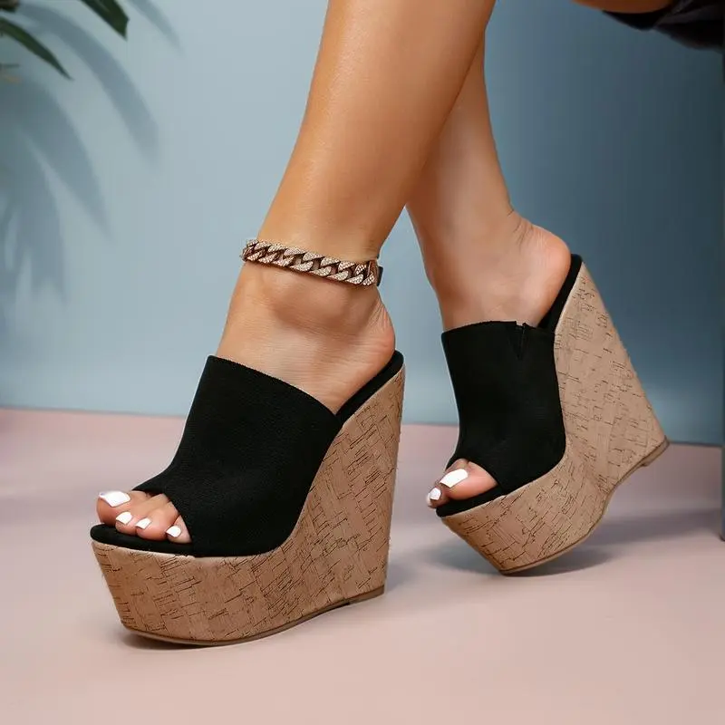 [Black Platform Sandals] Black Chunky Wedge Heel Women's Platform Sandals | Open-Toe, Ankle Strap, Rhinestone Accents - Slip-On Summer Beach Shoes for Casual & Formal OccasionsGift