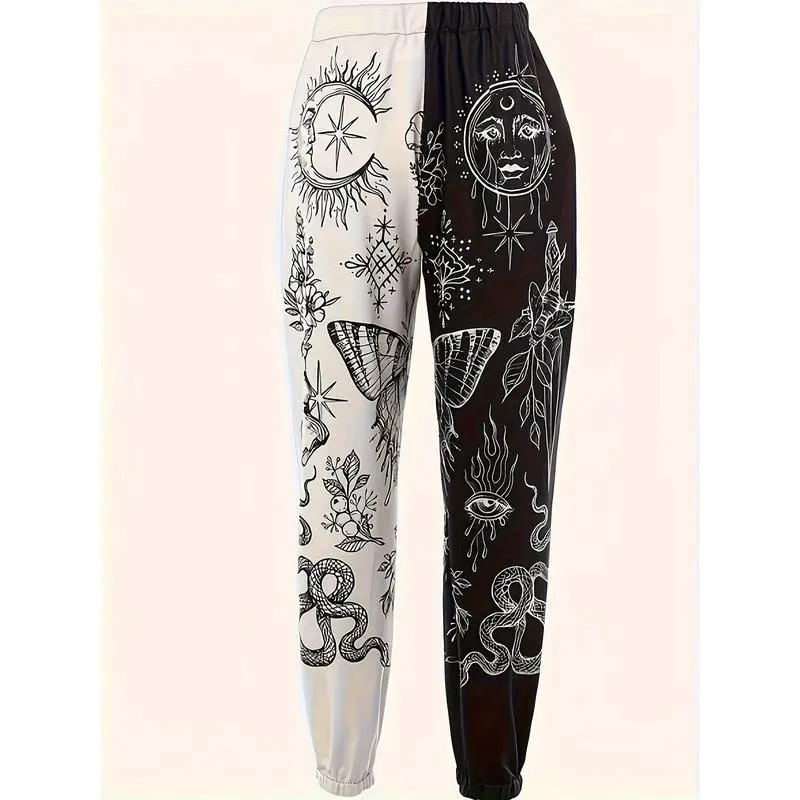 Women'sBohemianHippieJoggers-HighWaist,ColorblockGraphicPrintwithSunandMoonDesign,CasualLooseFitYogaPants,Polyester,MachineWashable-PerfectforAllSeasons