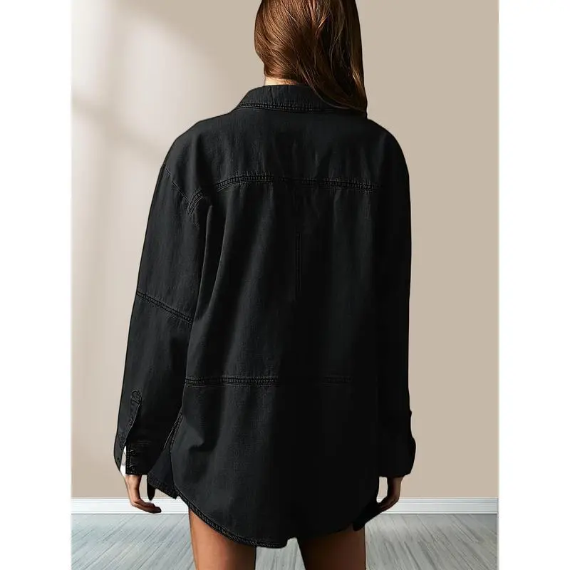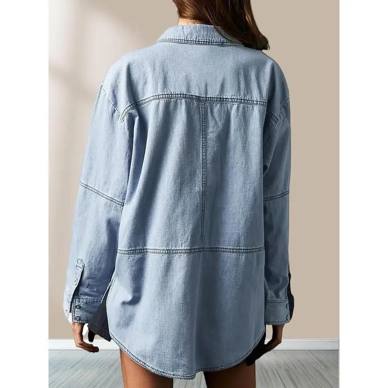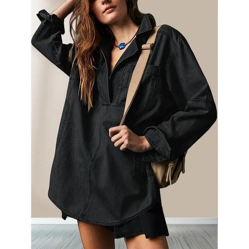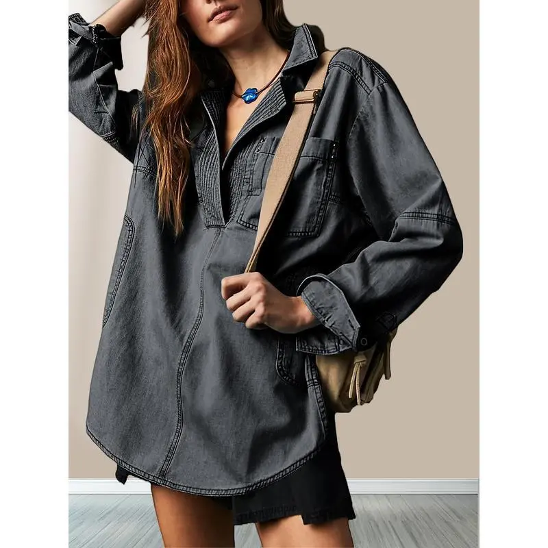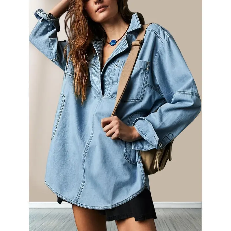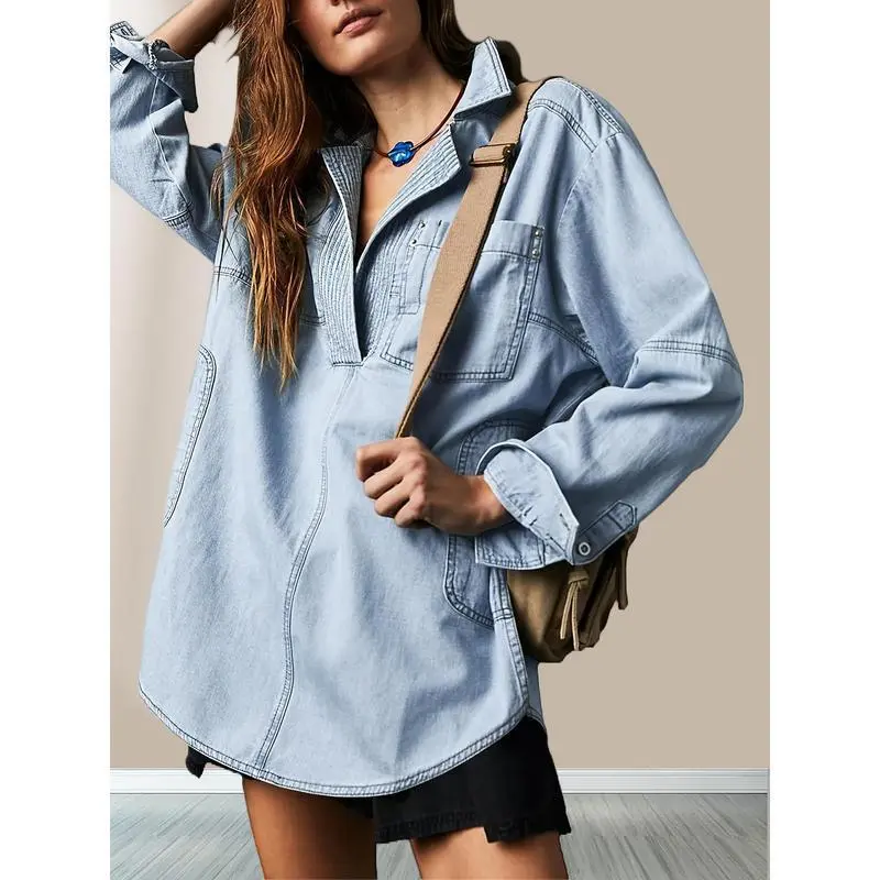 Women's Denim Pullover Leisure Button V-neck Shirt Loose Design Long Sleeve Denim Jacket with Pockets
