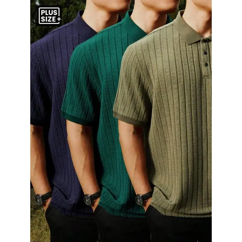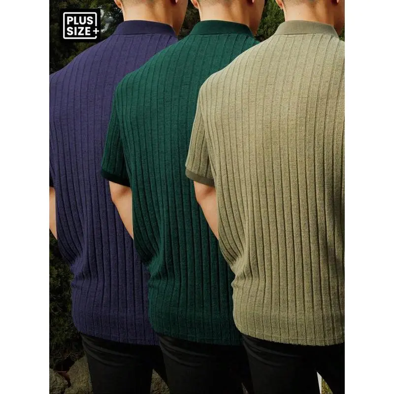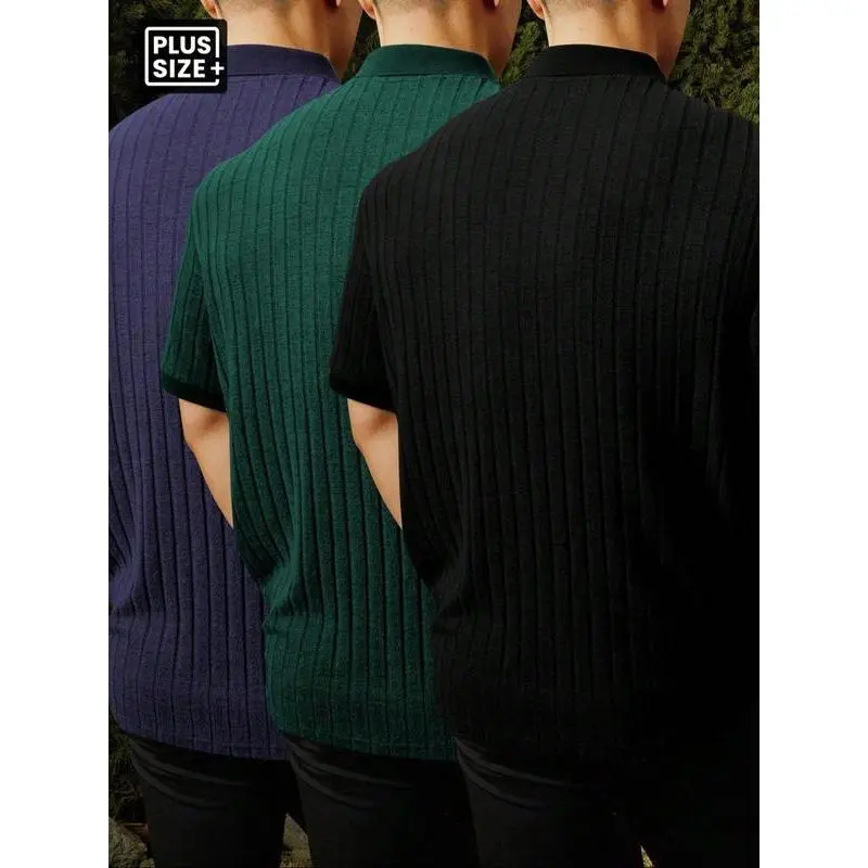 【Plus Size】 Solid Ribbed Polo Shirt, Regular Fit Casual Short Sleeve Collared Top for Summer, Men's Clothes for Daily Wear, Tropical