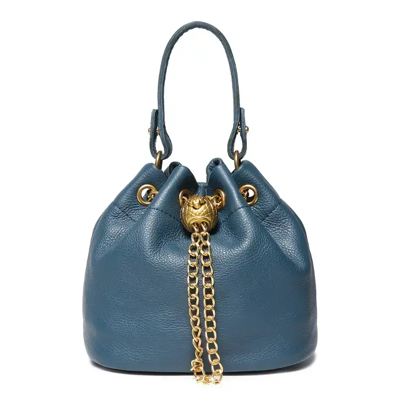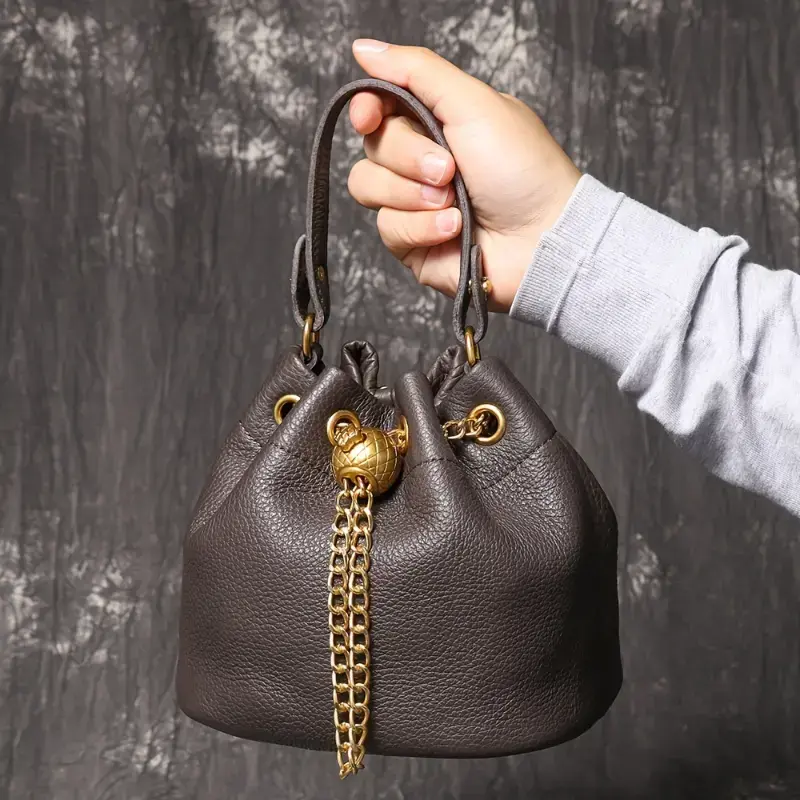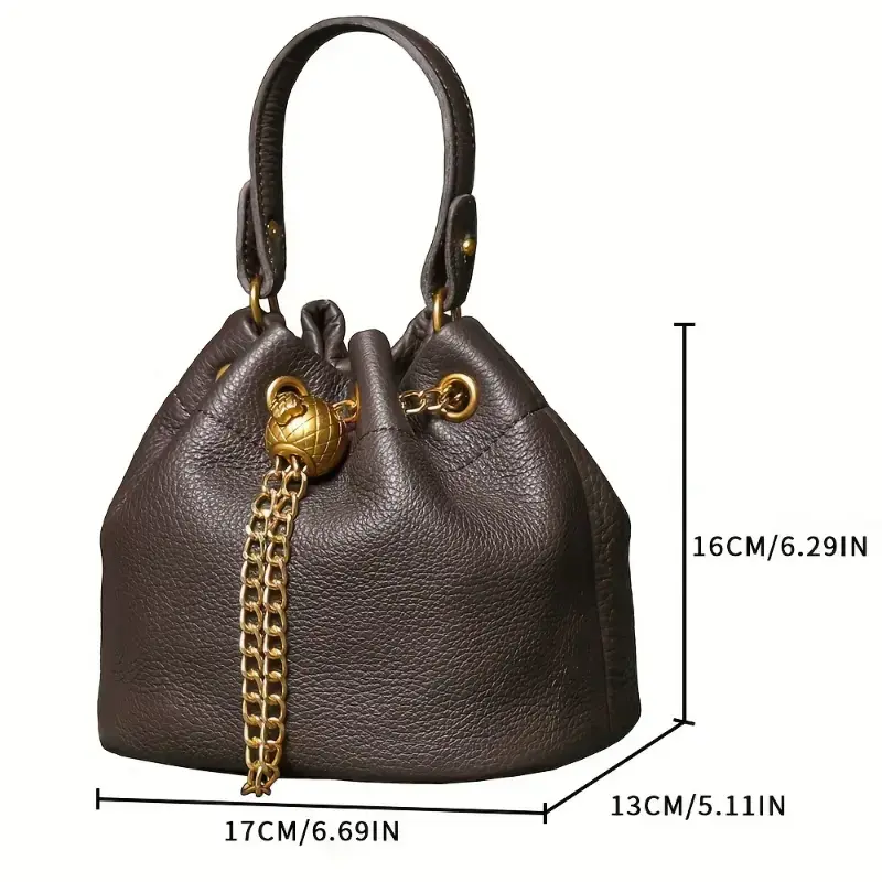 Stylish Black Genuine Leather Drawstring Handbag for Women - Versatile Crossbody & Bucket Bag with Decorative Golden Chain, Mobile Phone Pouch, and Polished Finish, Purse