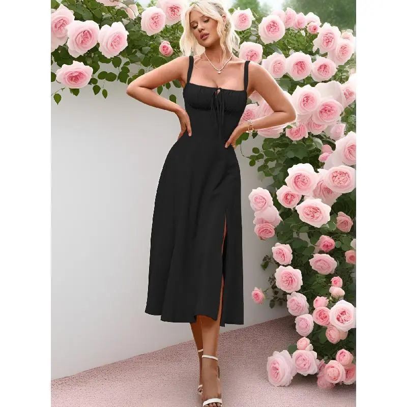 Women'sPlainRuchedBoningCorsetMilkmaidDress,LaceUpDress,PartyDress,SplitThighDress,TieFrontDress,ElegantSquareNeckMidiDress,DressesforWomen,FrenchyStyleDress