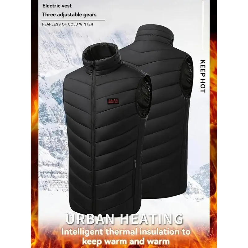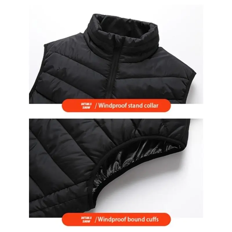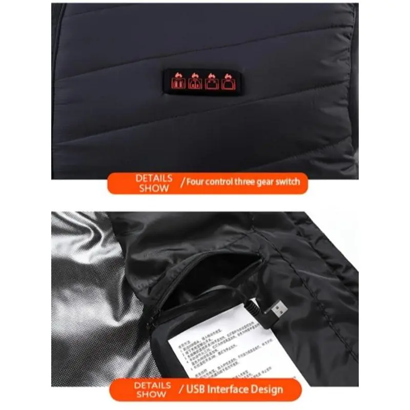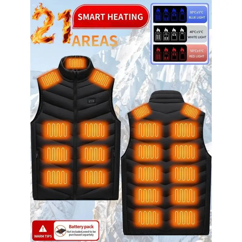 【USB Heating】: Equipped with USB power supply for convenient heating, ensuring warmth during outdoor autumn and winter activities. 【21 Heating Zones】: Features 21 individual heating zones for enhanced heat distribution across the back and chest areas. 【Sleeveless Design】: Designed without sleeves, allowing for unhindered arm movement while retaining warmth in core areas. 【Zipper Closure】: Includes a functional zipper closure for an easy and secure fit, adding a practical element to the garment. 【Regular Length】: Cut to a regular length, providing a balanced silhouette that suits various body types without excess bulk.