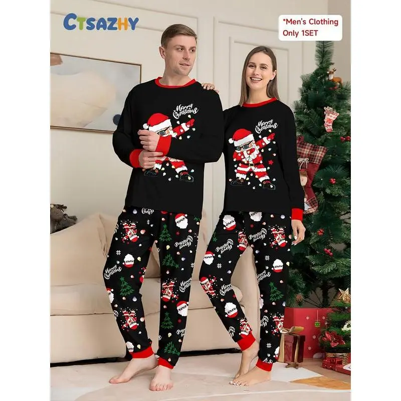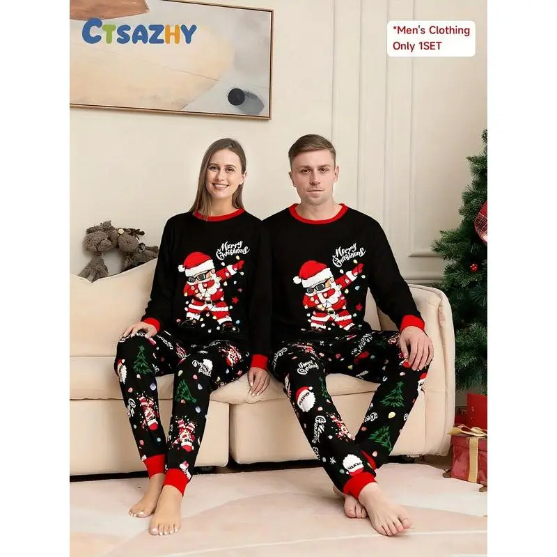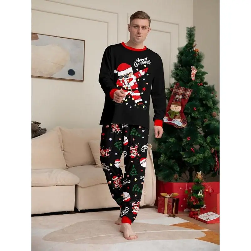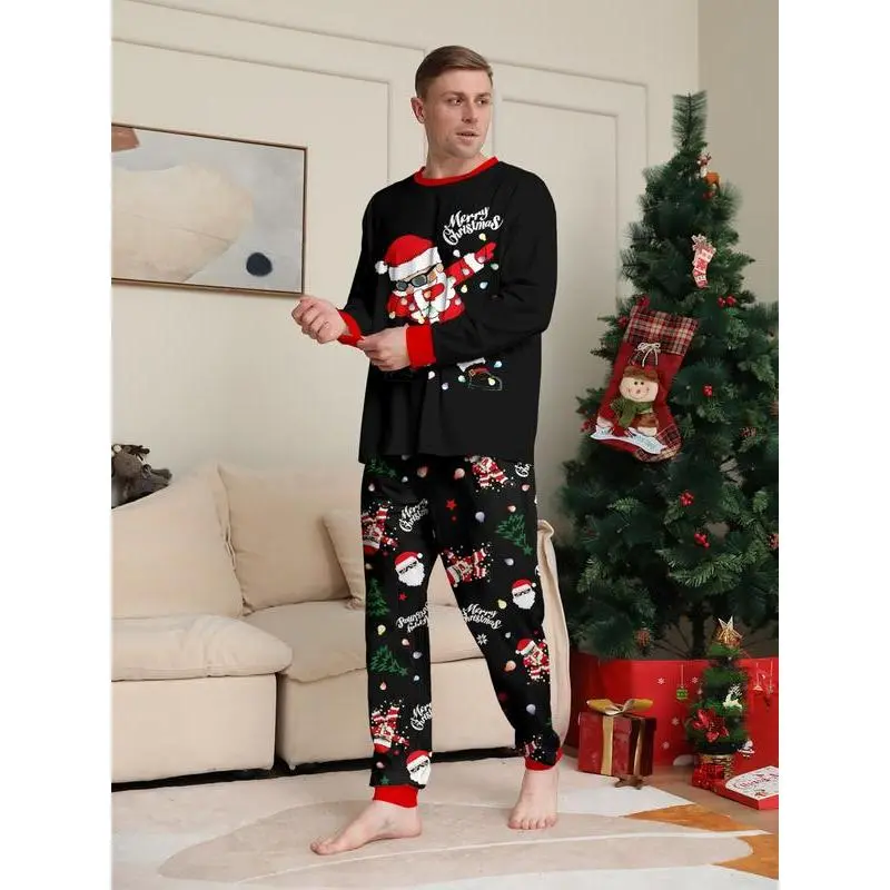 Men's Christmas, autumn and winter casual home pajamas set, wearing sunglasses, Santa Claus color light string printed long-sleeved top with full-printed trousers, holiday home two-piece set
