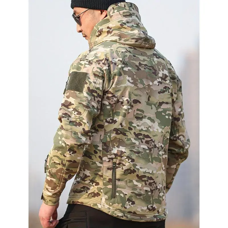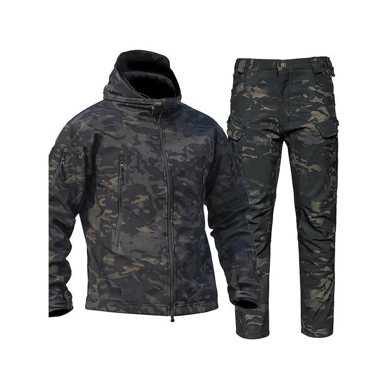 Men's Camo Sharkskin Jacket & Fleece-Lined Pants Set - Windproof, Warm Hooded Outfit for Hiking, Hunting & Outdoor AdventuresGift