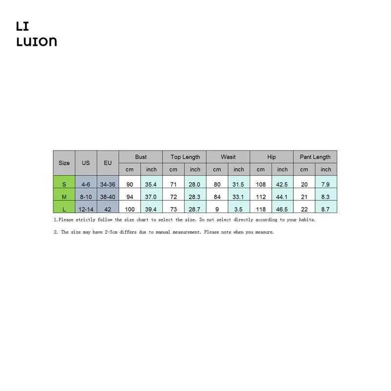 Size (cm) S Tops Length: 71 Bust: 90 Pants Length: 20 Waist: 80 Hip: 108 M Tops Length: 72 Bust: 94 Pants Length: 21 Waist: 84 Hip: 112 L Tops Length: 73 Bust: 100 Pants Length: 22 Waist: 90 Hip: 118 ? Size (inch) S Tops Length: 27.95 Bust: 35.43 Pants Length: 7.87 Waist: 31.5 Hip: 42.52 M Tops Length: 28.35 Bust: 37.01 Pants Length: 8.27 Waist: 33.07 Hip: 44.09 L Tops Length: 28.74 Bust: 39.37 Pants Length: 8.66 Waist: 35.43 Hip: 46.46 ? Specifications: Material: 5%Cotton and 95% Polyester Size: S/M/L Color: Multi-Color Pattern: Solid Sleeve: Sleeveless Neck: U Neck Gender: Women ? Package Contents 1 * Set(1 * Tops, 1 * Shorts) ? Note: 1. Due to manual measurement, there may be small errors in size. 2. Depending on the computer monitor used, colors may a little different from actual colors. ? Promise If the product has any quality problems, please let us know and we will help you solve it as soon as possible.