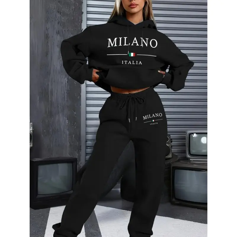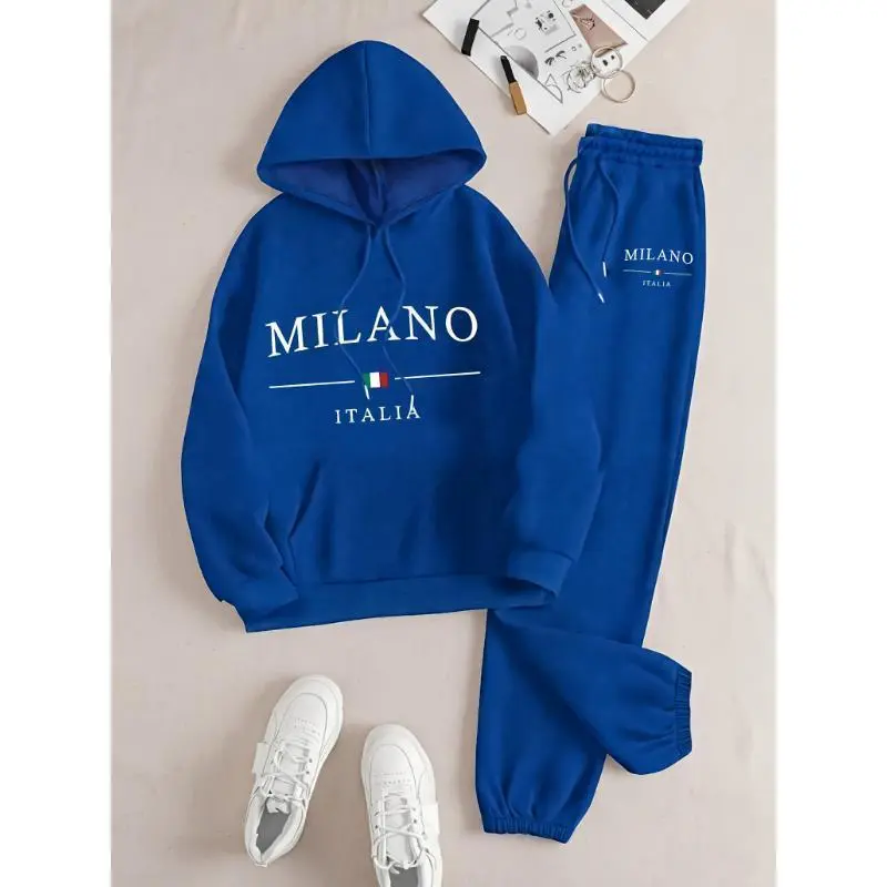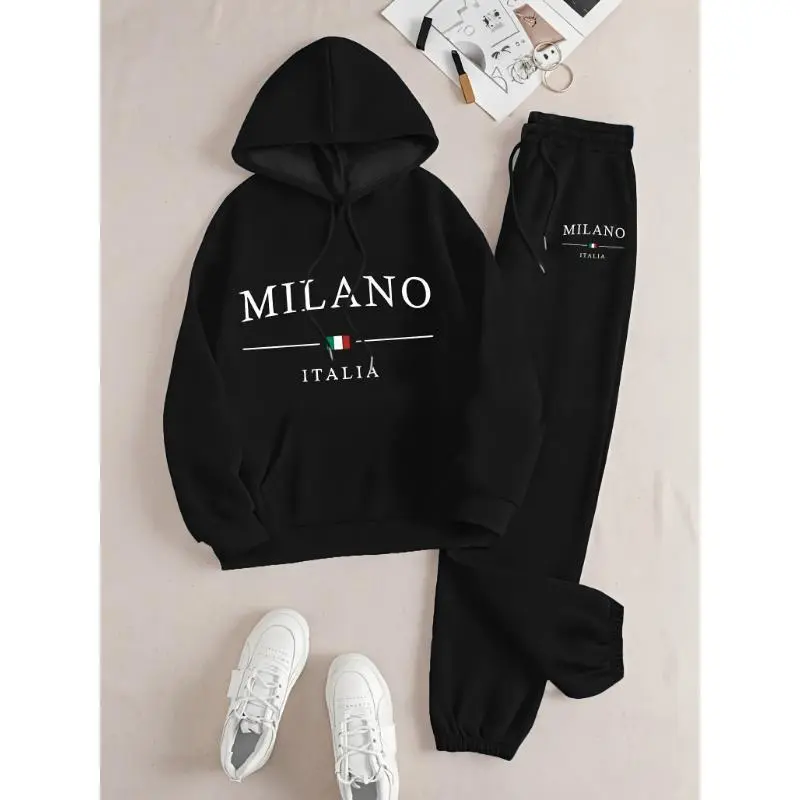 &1set Milano Italy Theme Women's Casual Sweatshirt and Sweatpants Set - Long Sleeve Pullover with Hood, Cartoon Print, Polyester Knit Fabric, Pockets - For Autumn/Winter - Perfect for Women - Cozy and Stylish Loungewear