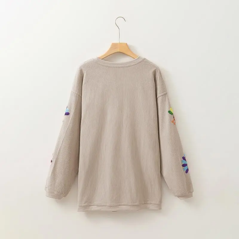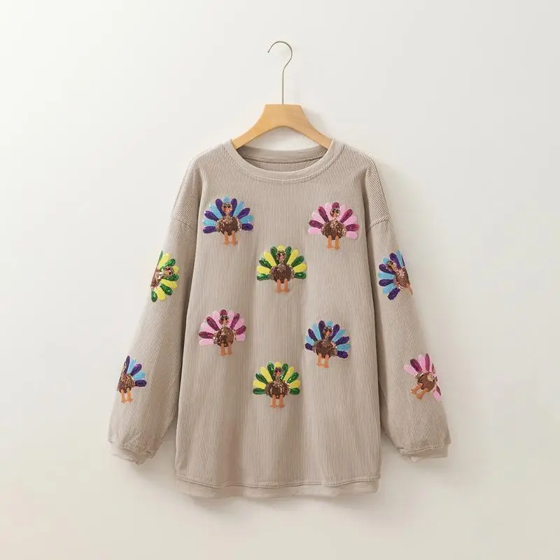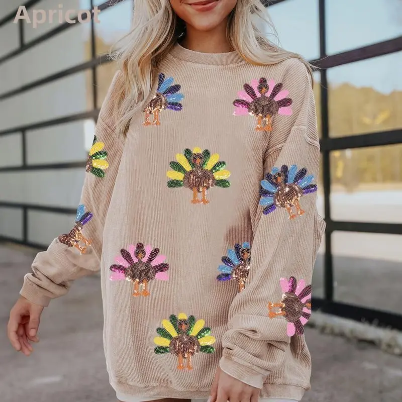 Women's Sequin Turkey Graphic Corded Drop Shoulder Thanksgiving Day Baggy Sweatshirt, Glitter Christmas Fashion Pattern Festive Pullover