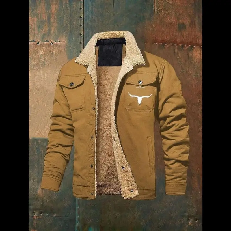 Men's Retro Western Winter Fleece Jacket Warm Fleece Lined Coat Lapel Work Cargo Jackets Sherpa Lined Trucker Jackets