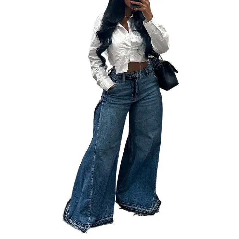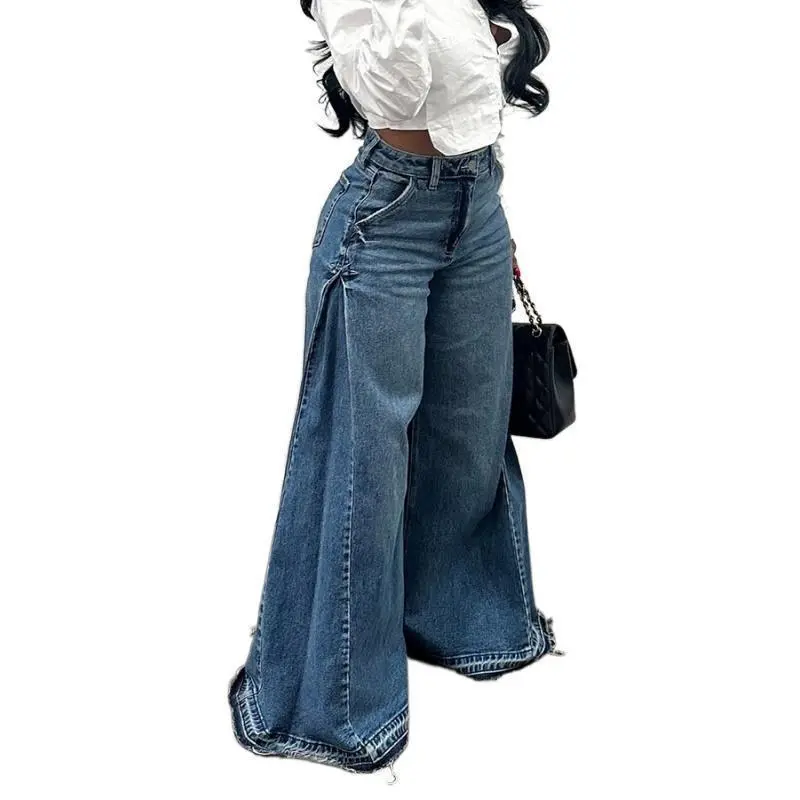 2025 Spring Retro Style Wide-Leg Denim Flared Pants with Fringes jeans levant cola 100 colombianos