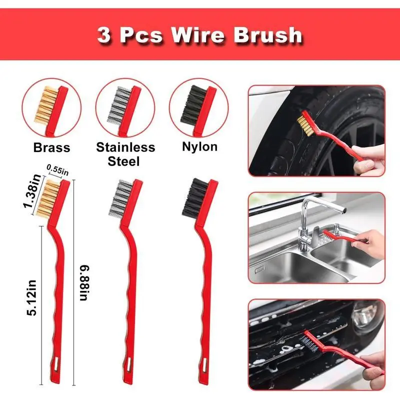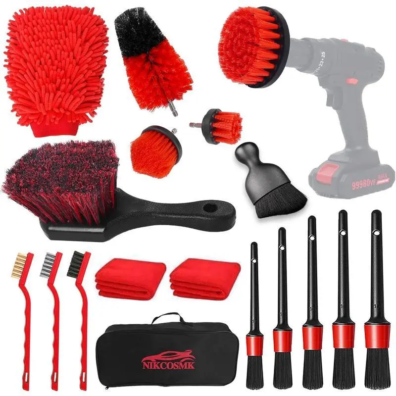 The Professional car wheel rim brush makes detailing a car much easier! Our car wash kit contains car detailing brushes, drill brushes, wire brush, tire brush, car interior detailing brush, microfiber cloth, car washing mitt and orgainzer bag.Contains everything you need to clean your car, helps to clean your car efficiently. 4PCs medium stiffness electric drill brush set : Made of high quality PP, wear-resistant and heat-resistant, easy to clean. : 1/4 inch universal drill shaft with hexagon shape.Compatible with cordless screwdrivers or drills. : Suitable for cleaning car rims, and is also an ideal choice for bathrooms, bathtubs, tiles, floors, sinks, corners, grills, etc. No scratches, strong adsorption, can easily remove dust, suitable for cleaning, dedusting, washing, etc. Car Detailing Brushes Features High quality: car interior cleaning brush made of bristles, ultra soft & elastic, which quickly attracts mini particles in narrow/deep/small areas.Dust Removal Powerful plastic ferrule with high binding capacity, avoid dropping the bristle Wet & Dry Use: Car detail cleaning brushes are gentle enough for car interior cleaning, such as dashboard, air vent, narrow crevices of leather seat, car window, interior and exterior, etc. but also tough enough to remove heavy dirt or oil from wheel/engine compartments/emblems /Grills/brake calipers and other hard-to-reach areas Ergonomic Design: Solid PP handle, notch design, easy and comfortable to grip, non-slip and reduce fatigue Car Wash Mitt Quality Rim Glove - The glove lining is made of pure waterproof cotton fabric and is non-slip.Prevents slipping and hand injuries from rim edges.Not made of non-woven fabric, your hands won't get wet from water during car wash Highly Absorbent - Thanks to the integrated sponge on the inside, the chenille wash mitt can absorb a lot of water.After the dust is picked up, it will no longer rub back and forth on the surface, minimize the risk of scratching the paint surface. [Professional 18Pcs Car Cleaning Kit] Our 18Pcs drill brush car detailing includes car detailing brushes x 5, drill brushes x 4, tire brush x1,wire brushes x 3, car wash towels x 2,car wash mitt x 1, car interior cleaning brush x 1, bag x1.After many upgrades and improvements, this interior car cleaning kit will be able to meet your car cleaning needs interior and exterior and daily beauty maintenance.It is a thoughtful and gift choice for your husband, car enthusiasts and friends. [4 x Drill Brush Attachment Set ]Our car detailing Brushes come with 5 different stiffness and shapes drill brushes for washing automotive exterior and interior surfaces .These drill brush and polishing pads kit can also allows you clean bathroom surfaces, wheels, shower, toilet, kitchen, bathtub and carpet etc.Truly a way to make every nook and cranny of your house & car absolutely spotless! [5 x Car Detailing Brush & 3 x Wire Brush]5 different sizes of detail brushes tailored for car crevices, which combine toughness and flexibility.The detail brush's bristles are gentle, yet firm enough to provide just the right amount of pressure for effective cleaning.3 pcs wire brushes including 1 stainless steel brush, 1 brass brush, and 1 nylon brush.Wire Brush of different materials is suitable for different surface types, they will address all your cleaning concerns. [Short Handle Tire Brush]Feathered ends of bristles deliver safe and gentle cleaning, heavy duty non slip handle for the grip.Just only need our car cleaning tire brush and a bucket water & soap. Makes cleaning your Wheels and Rims a breeze. for the Wheel Well also. Easy to maneuver even in tight places this brush can return your Wheels and Rims to their original luster! [Multi-Purpose Car Interior Detailing Kit]This professional car detailing kit is the ultimate collection of car wash supplies. It can be used to clean various parts of the car, it can also be used for house cleaning, such as: cars, trucks, boats, toilets, kitchens, bathtubs, sinks, etc. Keep every corner of your car and home absolutely spotless with this premium car detailing kit interior cleaner! Own it, you have a cleaning assistant.