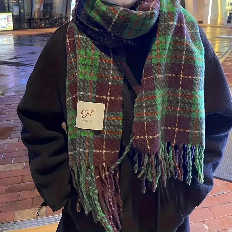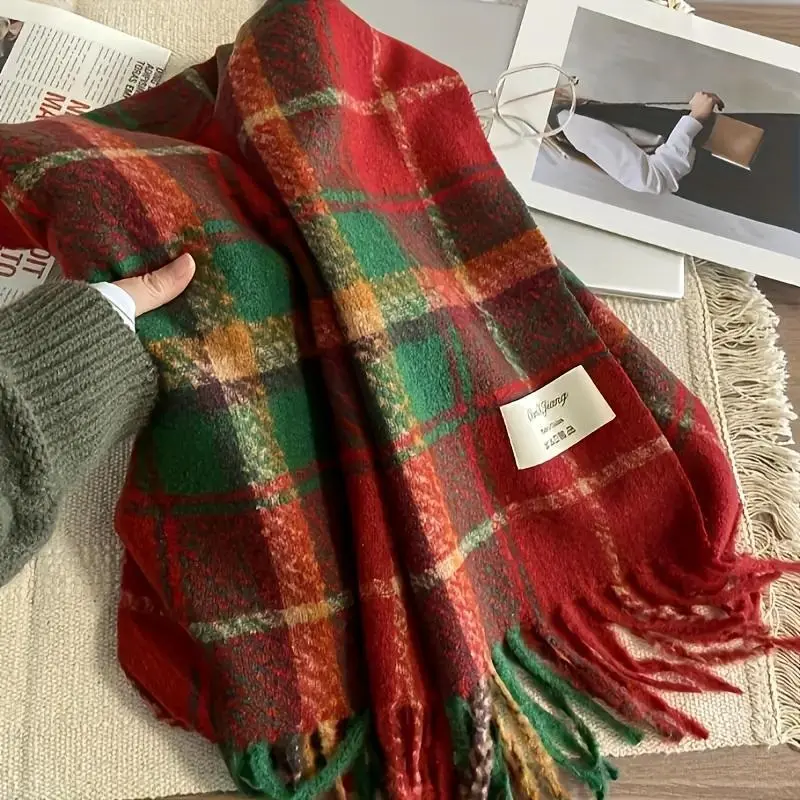 Christmas Plaid Tassel Scarf, Vintage Striped Thickened Warm Shawl, Outdoor Coldproof Neck Guard, Elastic Scarf for Winter Fashion