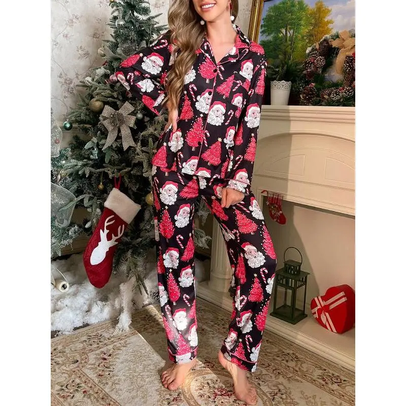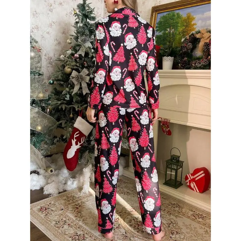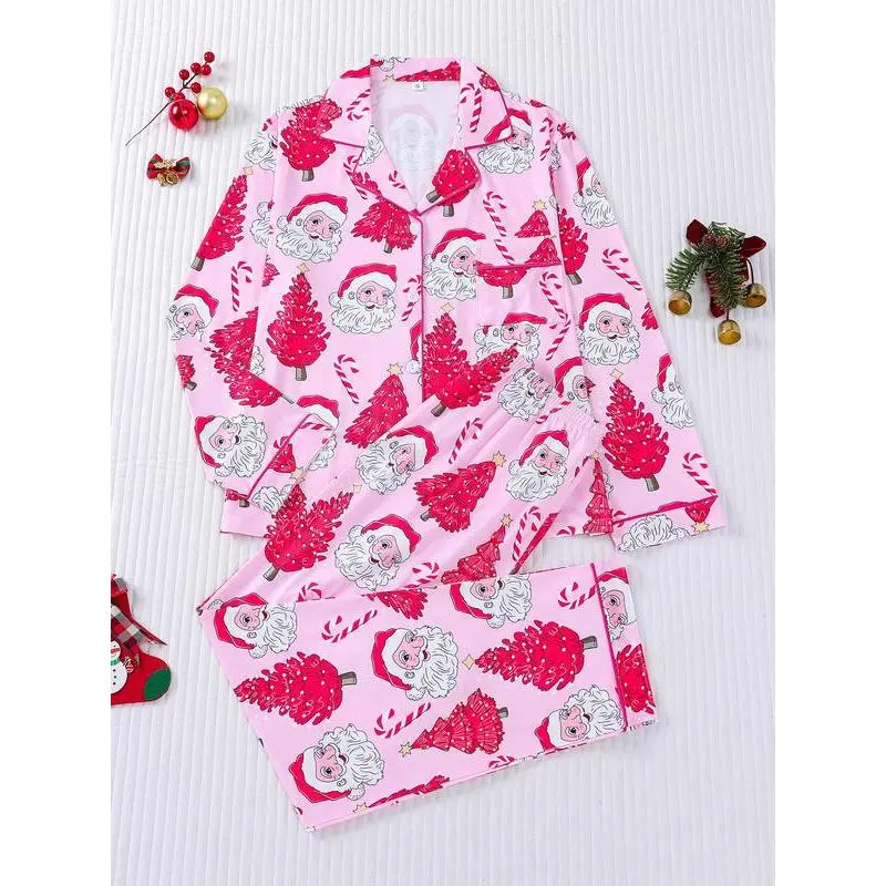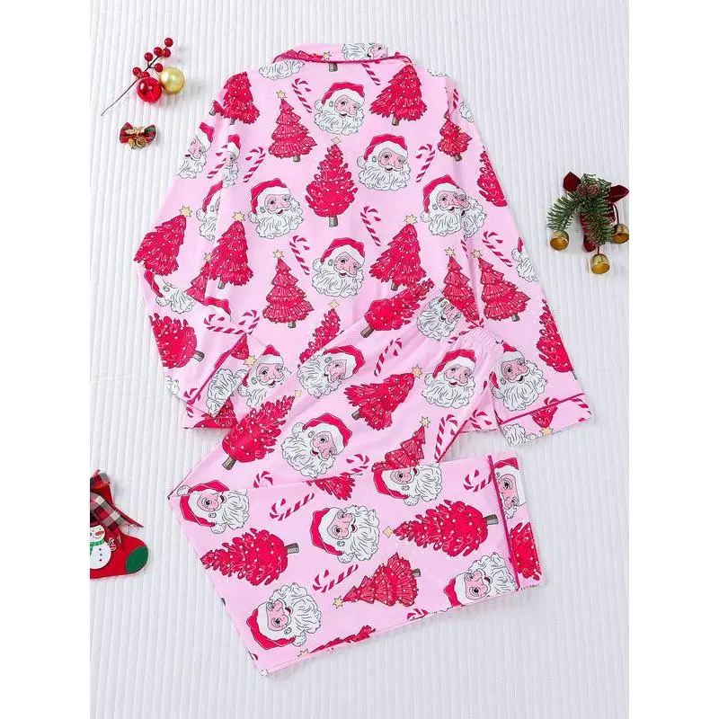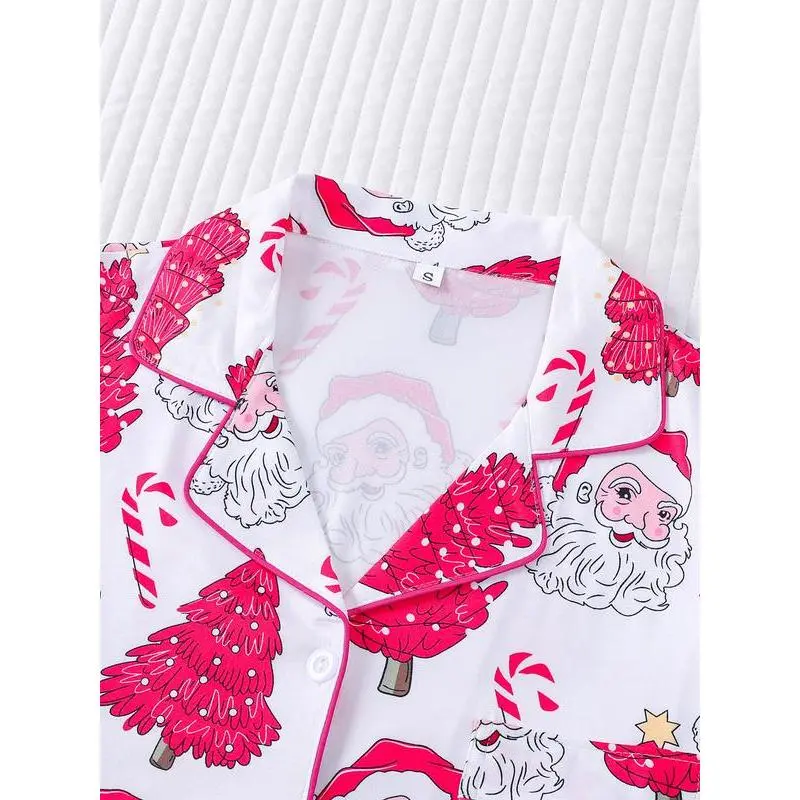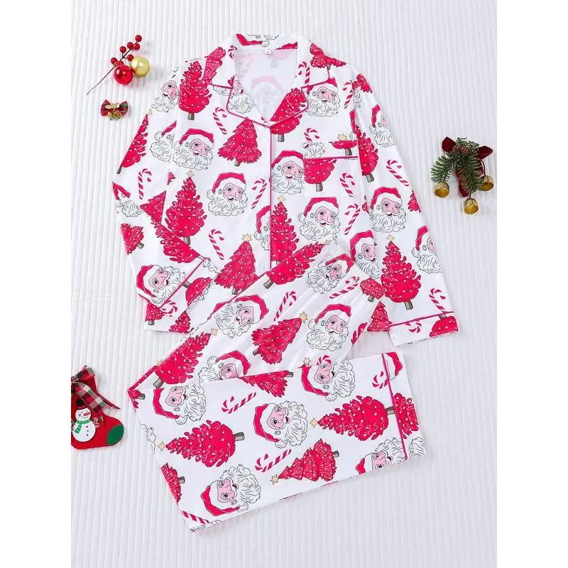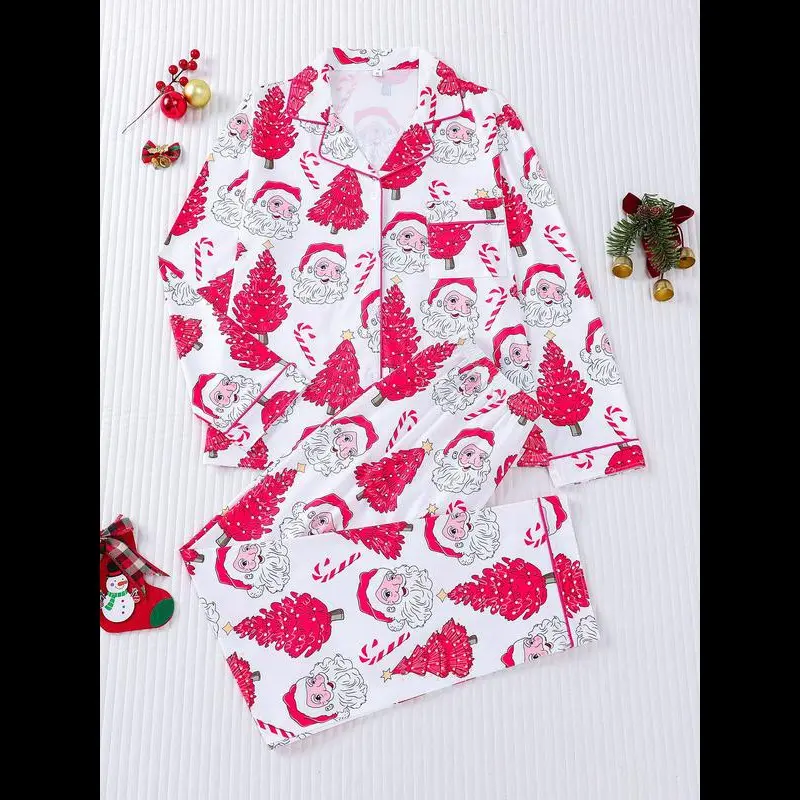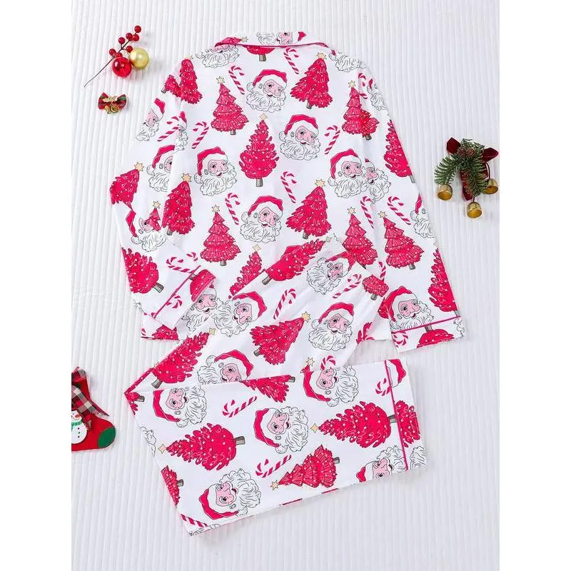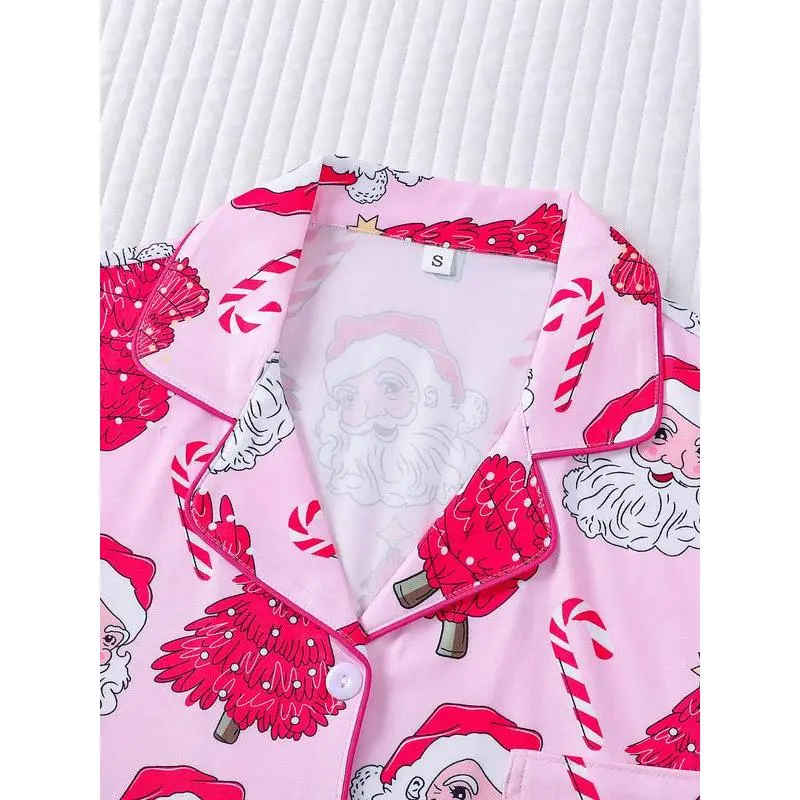 2-piece set of stars, Christmas trees, candy canes, Santa Claus, comfortable Halloween soft top, small pocket button top, elastic waistband, suitable for all seasons, home, sleepwear, clothing