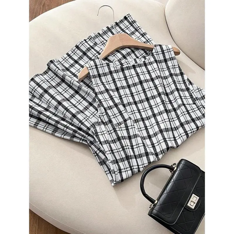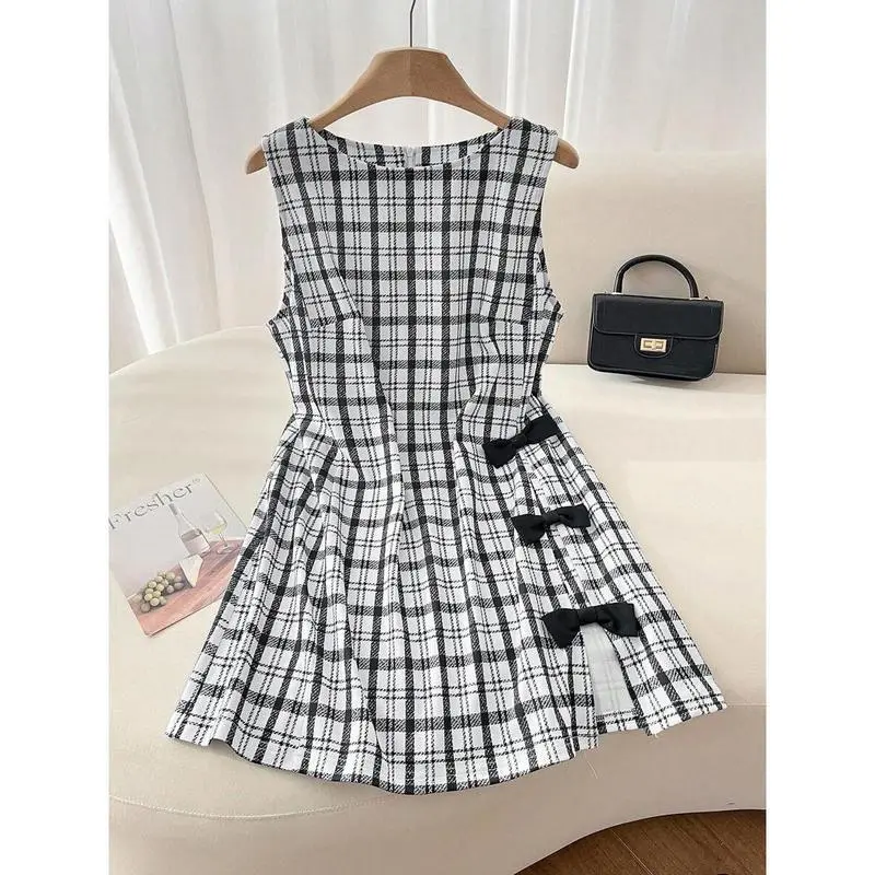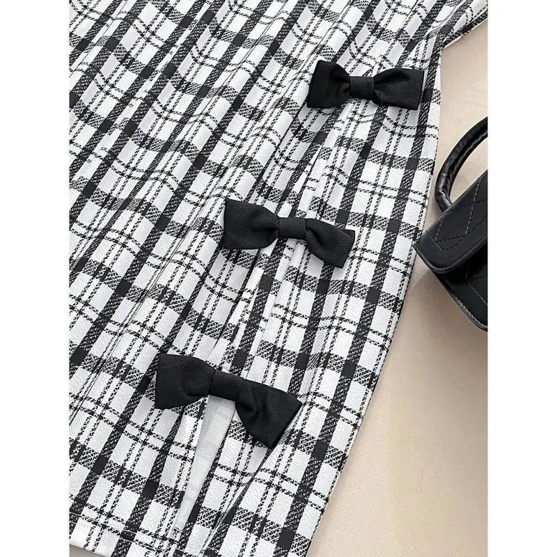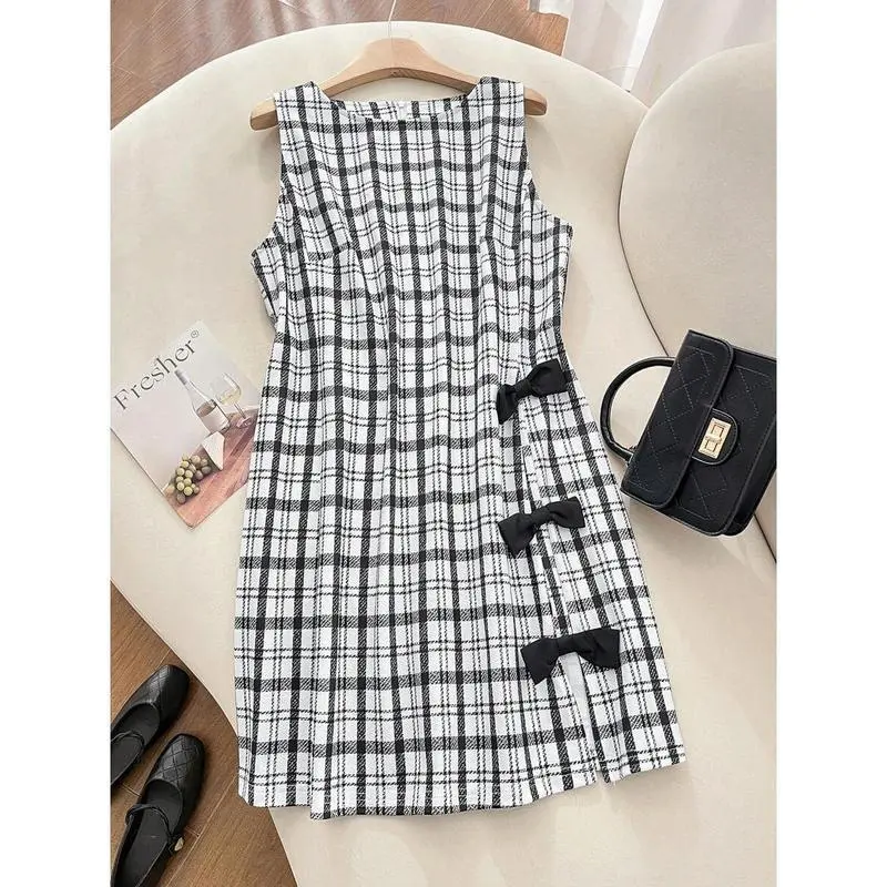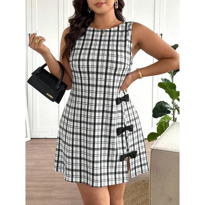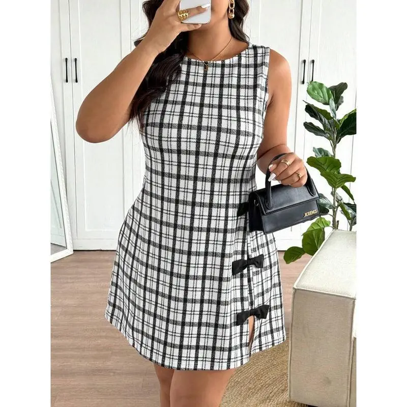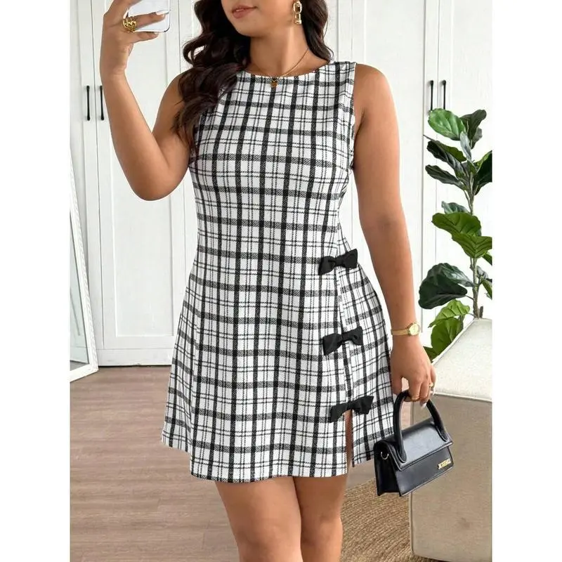 PlusSizeWomen'sPlaidPrintDress,SideBowDecor,Elegant&FashionableDesign,RoundNeckCasualEverydayCuteDress,GraduationDressFabricFitSleeveWomenswearFittedZipperMulticolorSummer