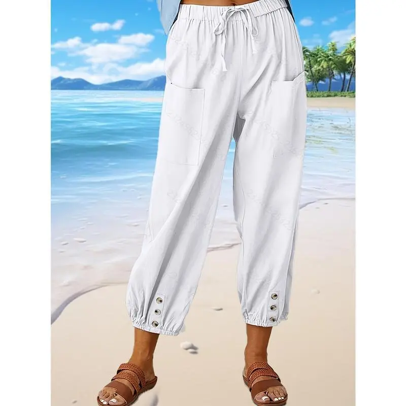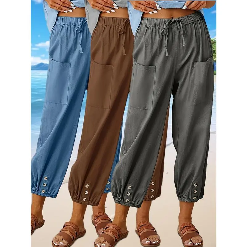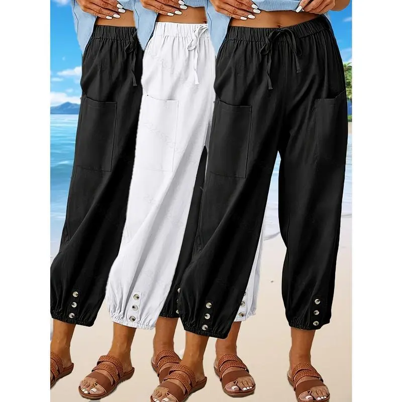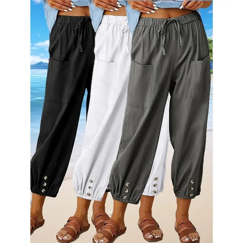 3-PackofLoose-FittingHigh-WaistedButtonedAndLinenCroppedWide-LegUnisexPantswithPocketsforEasyOutings.CasualTrousers,ElasticWaist