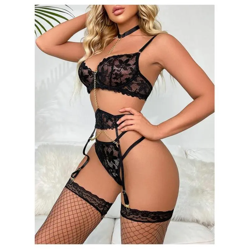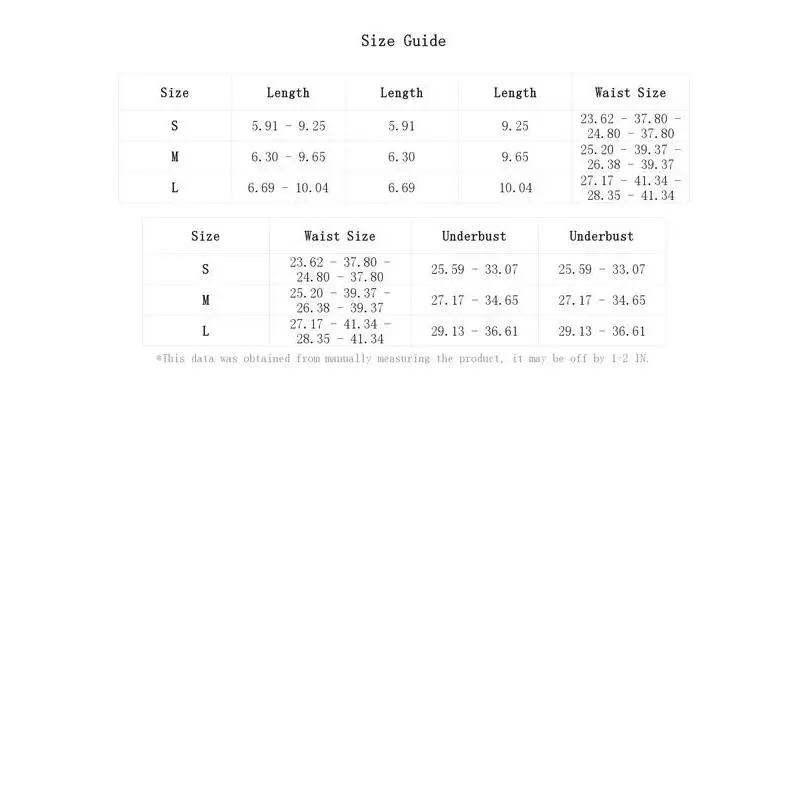 Fabric: Soft, medium stretch, comfortable, skin friendly Design: Floral lace, cut out, choker, v string, t back, low rise, garter, sheer, solid, 5 piece lingerie set with 1 pair stocking Occasion: Perfect for honey moon night, valentines day, wedding night, special night, anniversary and so on Care Instructions: Hand wash, do not dry clean Size Chart:??Product Measurement?? S:Length:5.9IN,Underbust:25.6-33.1IN,Length:5.9/9.3IN,Underbust:25.6-33.1IN,Waist Size:23.6-37.8-24.8-37.8IN,Length:9.3IN,Waist Size:23.6-37.8-24.8-37.8IN,Length:5.9/9.3IN,Underbust:25.6-33.1IN,Waist Size:23.6-37.8-24.8-37.8IN M:Length:6.3IN,Underbust:27.2-34.6IN,Length:6.3/9.6IN,Underbust:27.2-34.6IN,Waist Size:25.2-39.4-26.4-39.4IN,Length:9.6IN,Waist Size:25.2-39.4-26.4-39.4IN,Length:6.3/9.6IN,Underbust:27.2-34.6IN,Waist Size:25.2-39.4-26.4-39.4IN L:Length:6.7IN,Underbust:29.1-36.6IN,Length:6.7/10.0IN,Underbust:29.1-36.6IN,Waist Size:27.2-41.3-28.3-41.3IN,Length:10.0IN,Waist Size:27.2-41.3-28.3-41.3IN,Length:6.7/10.0IN,Underbust:29.1-36.6IN,Waist Size:27.2-41.3-28.3-41.3IN