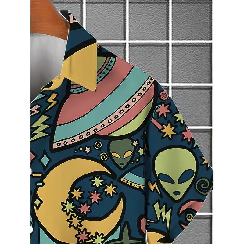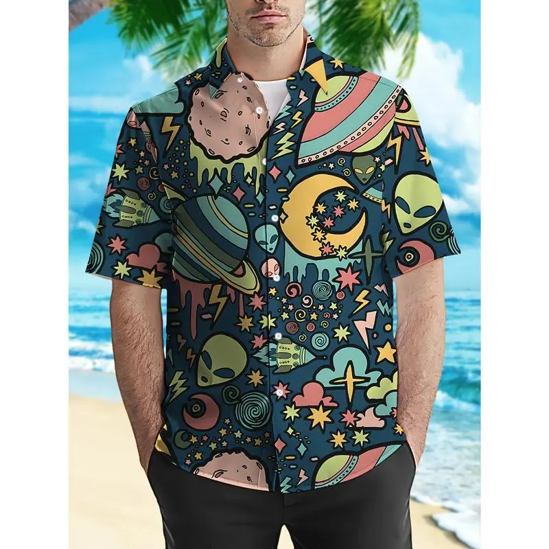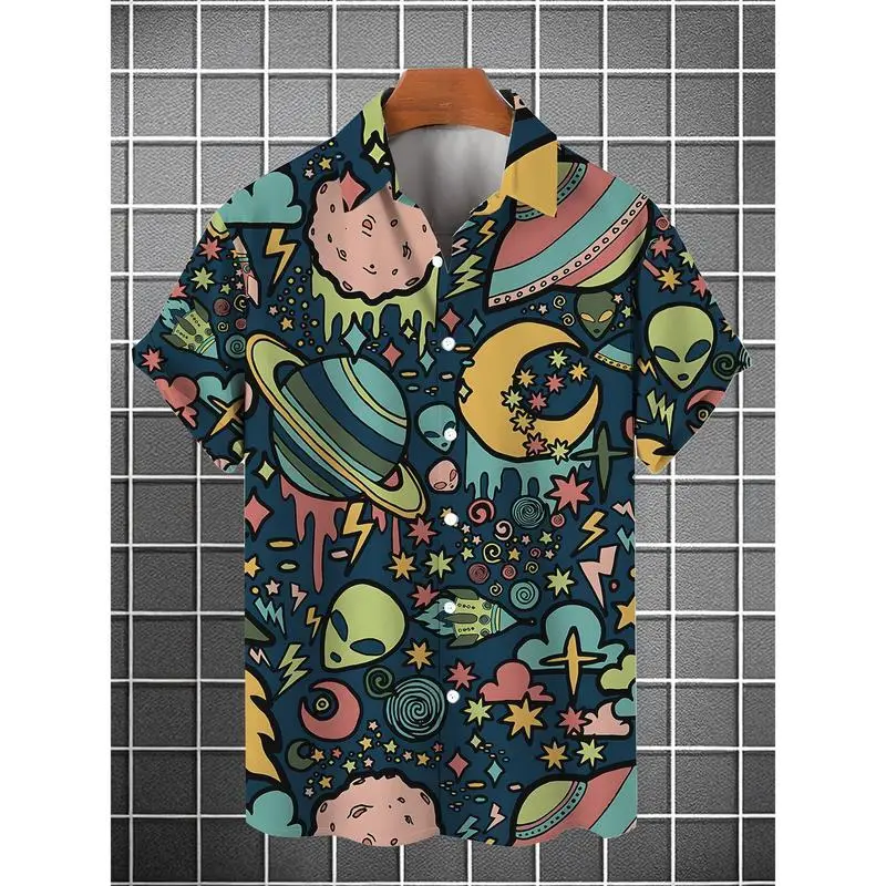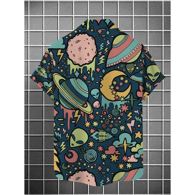 [Men'sHawaiianStylePrintShirt]Men'sSummerFashionPlanetAlienPrintShirt,BreathablePolyesterFabric,ShortSleeve,HawaiianStyle