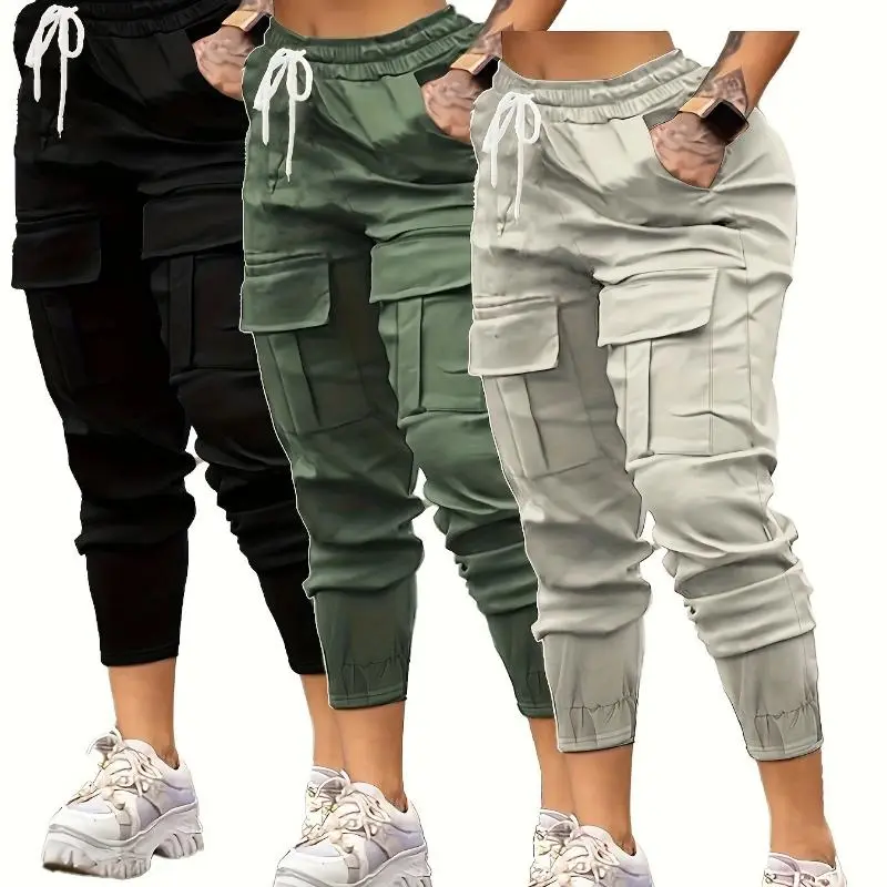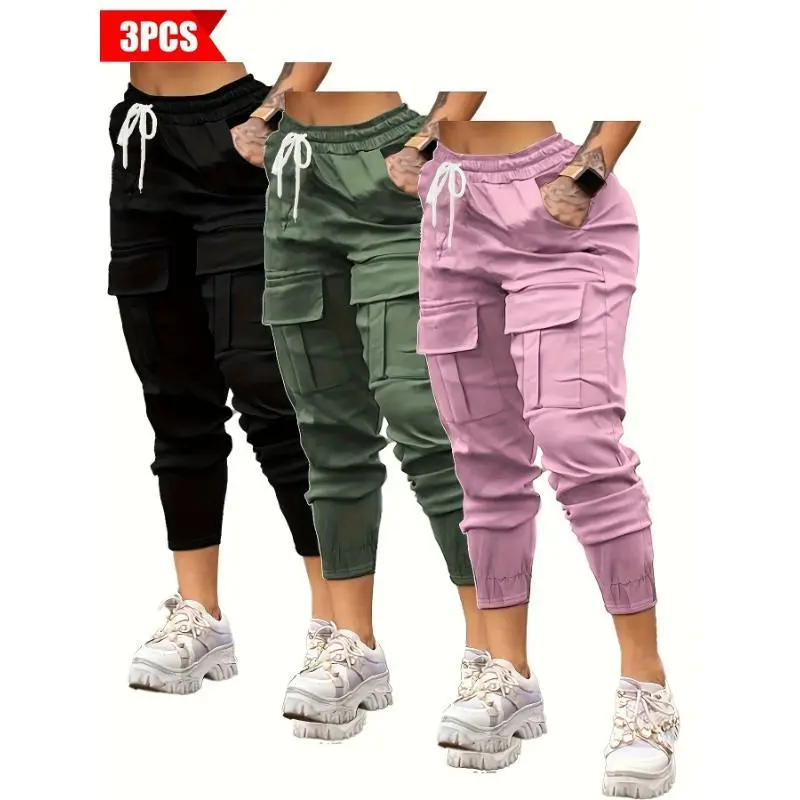 3-Pack Women's Casual Cargo Pants - Solid Color, Polyester, Non-Stretch, Sports Style With Pockets For Adults