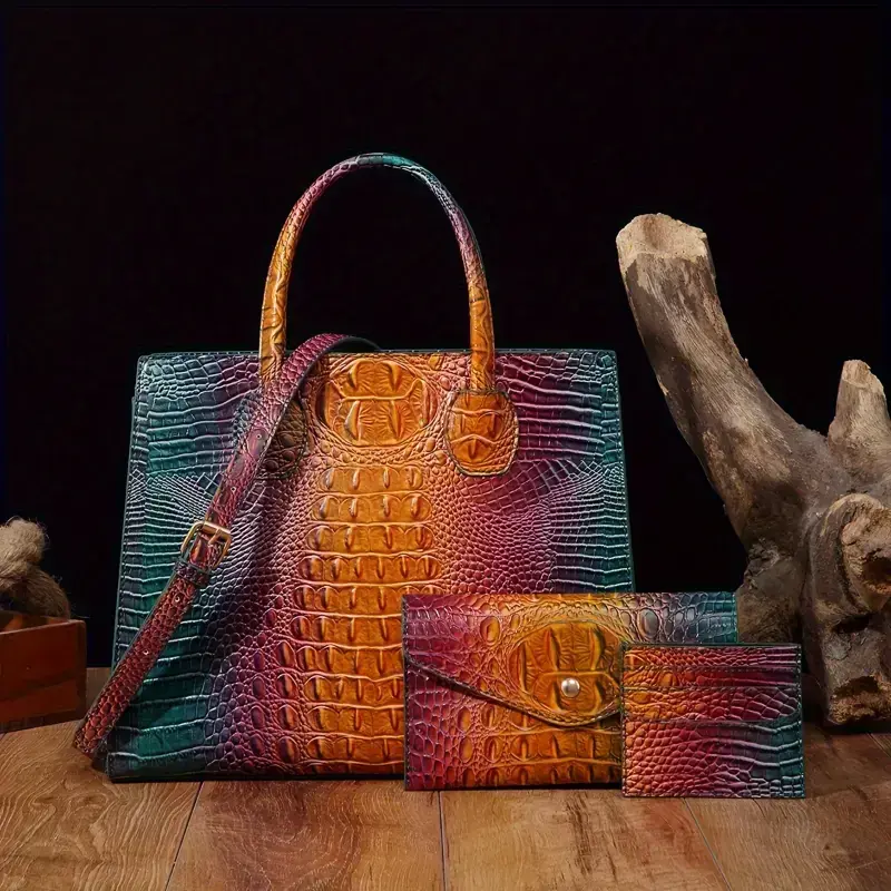 3 Pcs Crocodile Pattern Handbag & Purses Set, Multi-functional Vintage Top Handle Crossbody Bag & Business Clutch Bag & Card Coin Purse