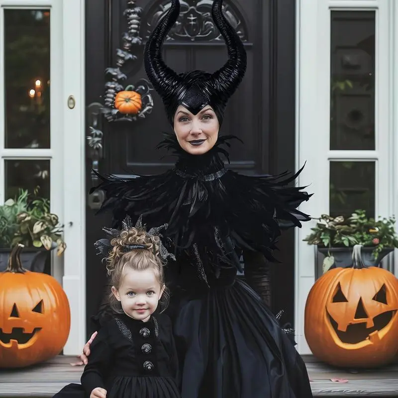 Evil Queen Feather Horns Costume for Women Black Cape Halloween Headpiece Shawl AccessoriesGift