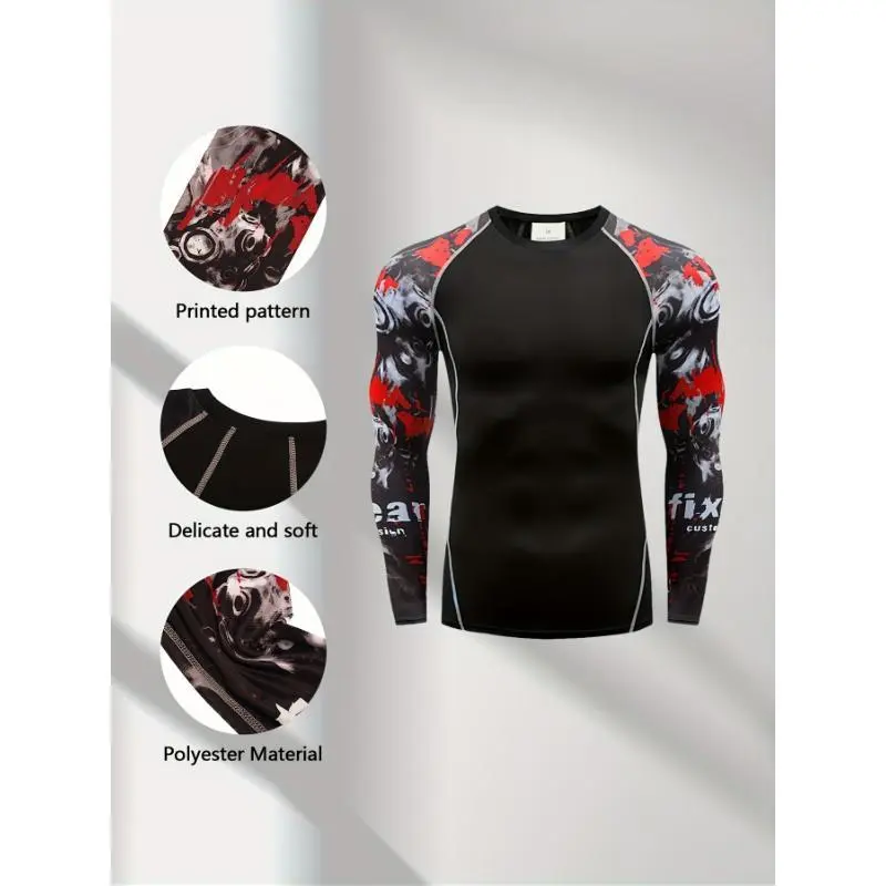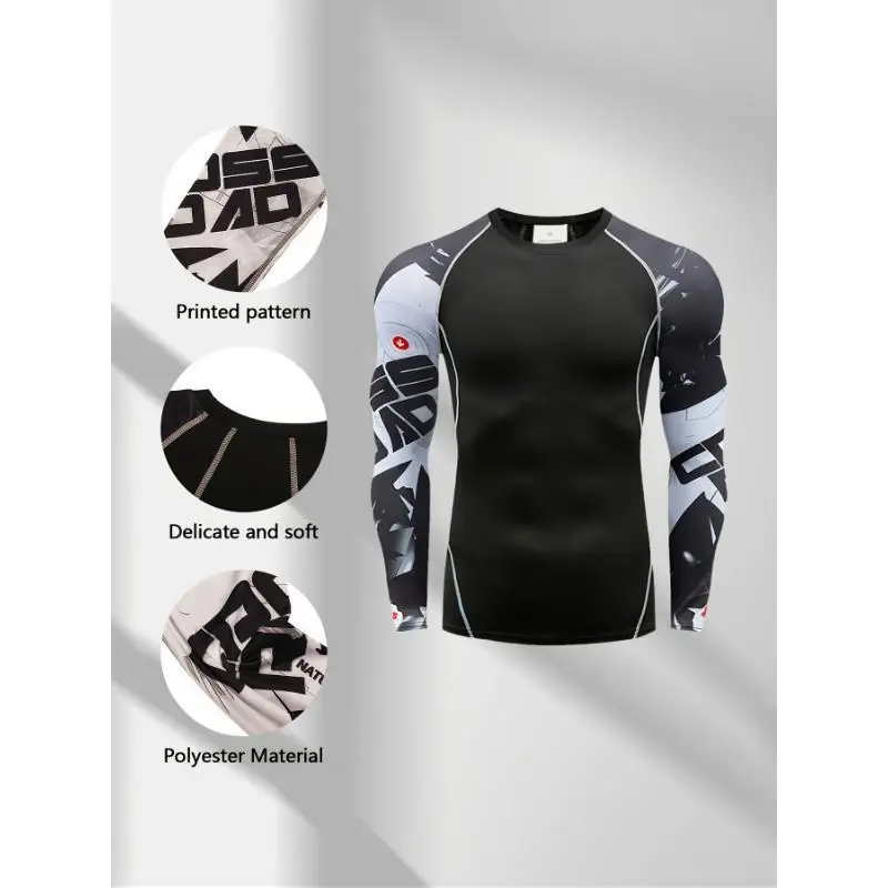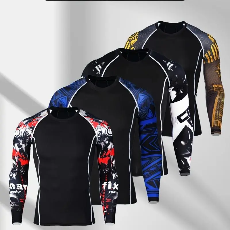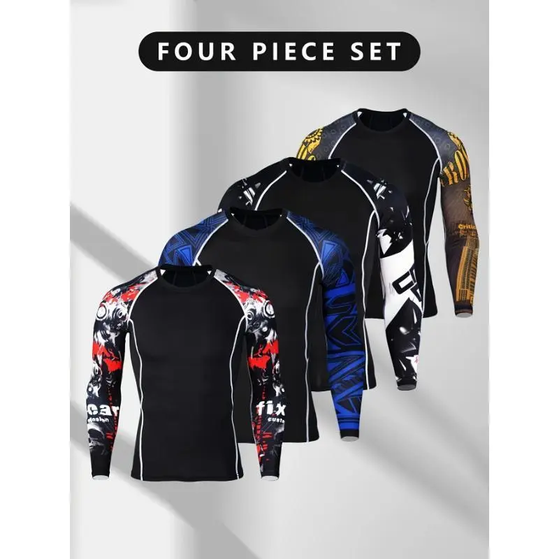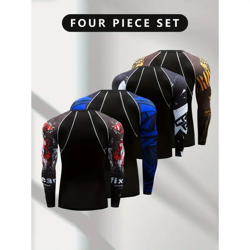 [4pcsCompressionSportsLongSleeve]4pcsMen'sSportsCompressionLongSleeve,HighElasticityCrewNeckSportsTopsWithTriangle/GraffitiPattern/LetterPrintSleeves,SuitableForRunning,Gym,Yoga,Casual,Outdoor