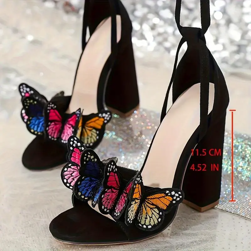 Women'sColorizedButterflyHighHeelSandals,SquareToewithCrossLace-upAnkleStrap,ThickHeelPartySandals