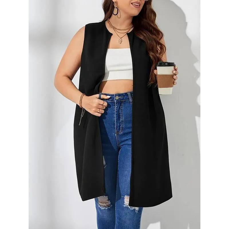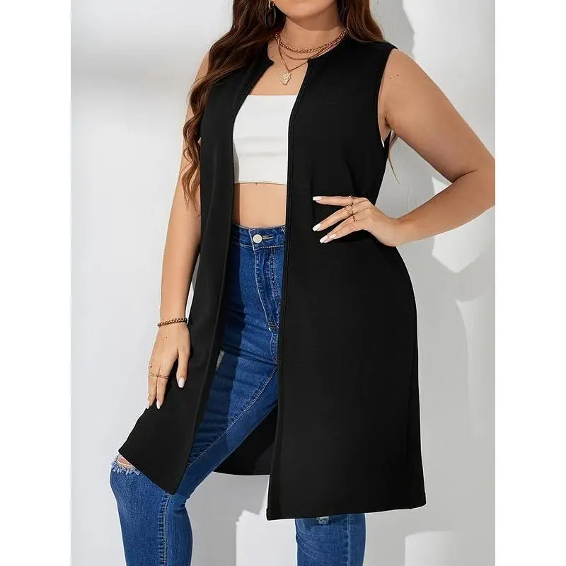 ��Plus Size�� Solid Color Open Front Waistcoat, Casual Sleeveless Longline Outerwear for Spring & Fall, Women's Clothes for Daily Wear, Shrug?VestGift
