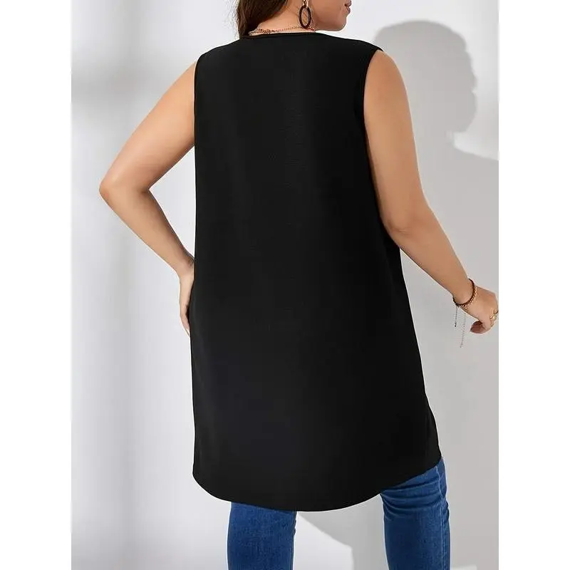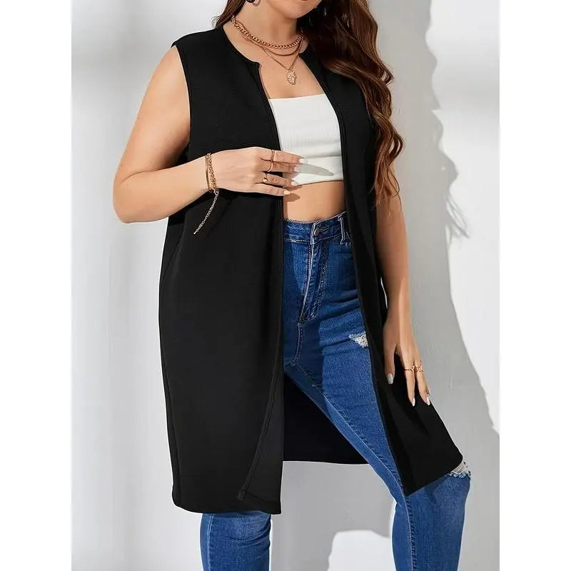 ��Plus Size�� Solid Color Open Front Waistcoat, Casual Sleeveless Longline Outerwear for Spring & Fall, Women's Clothes for Daily Wear, Shrug?Vest