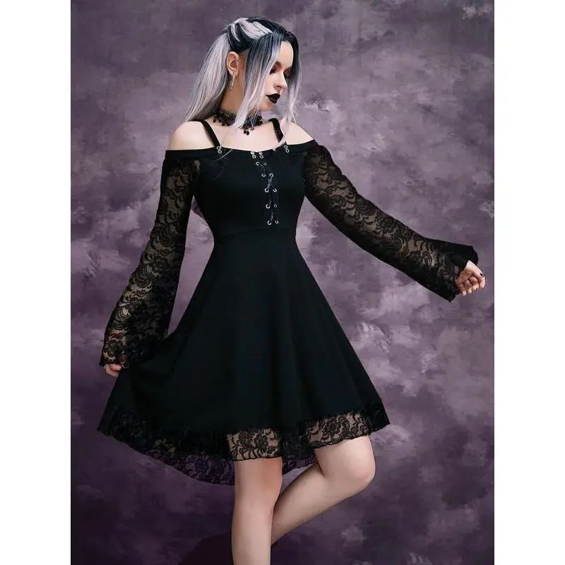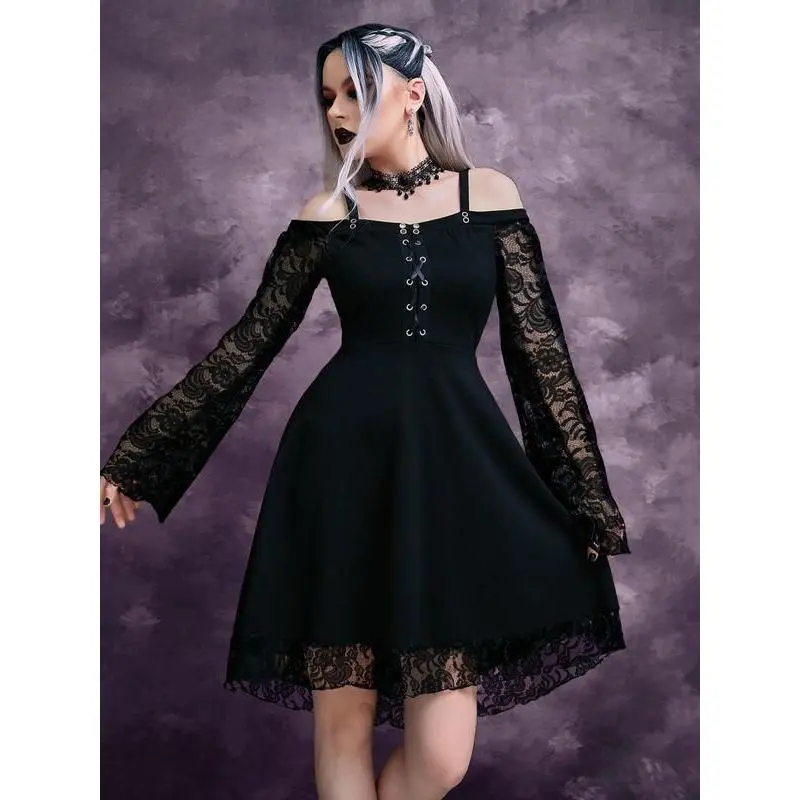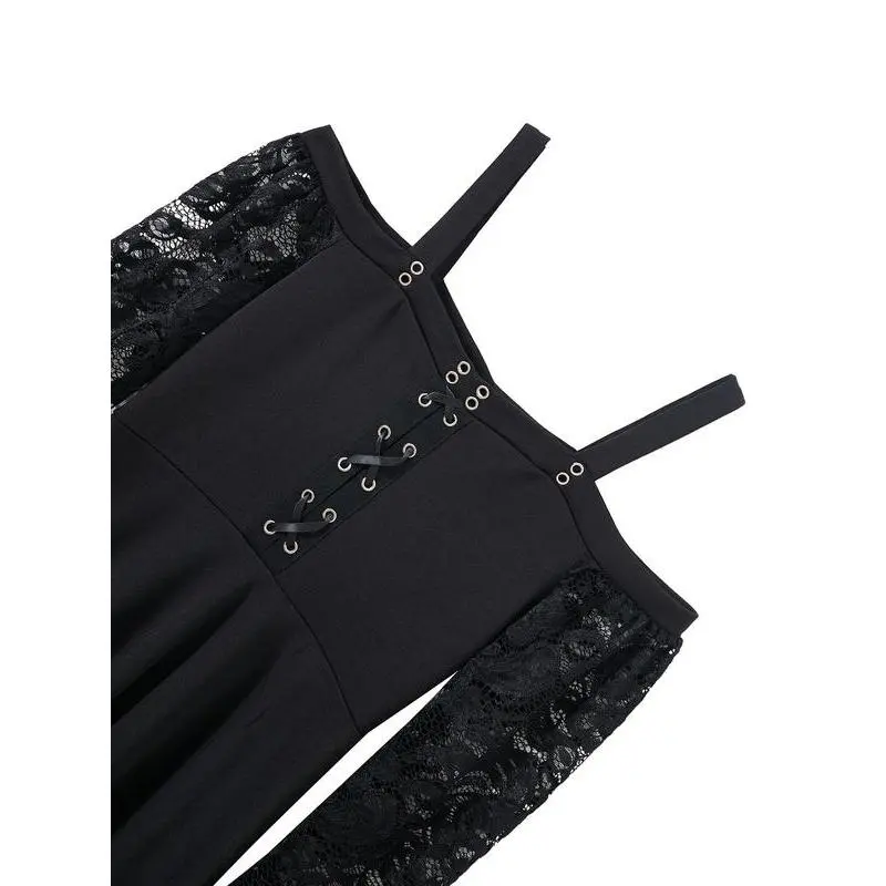 Women's Cold Shoulder Flounce Sleeve?Floral Lace Dress, Gothic Punk Style?Criss Cross Grommet Eyelet A Line Dress for Party Holiday, Ladies Clothes for All Seasons