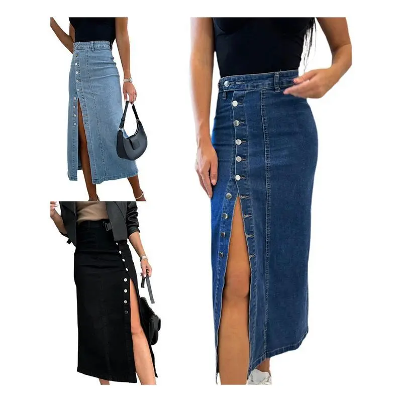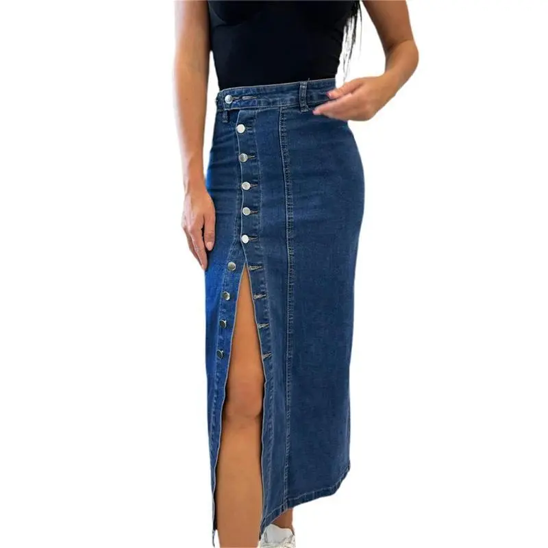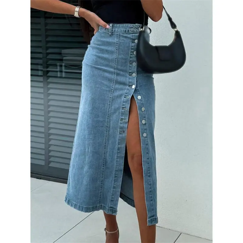 Women's High Waist Denim Skirt Solid Color Oblique Button Up Long Skirt for Travel, Beach, Shopping big-size jean skirt with slits, beautiful shape, dusty color, easy to coordinate