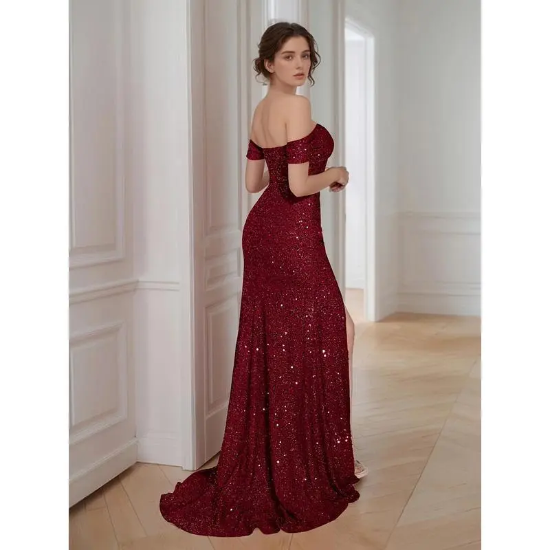 SequinedOffShoulderSplitHemDress-ElegantSweetheartNeckBodyconCourtTrainDress-Polyester-ForWomen-PerfectforParties&Banquets-IdealGiftforSpecialOccasions