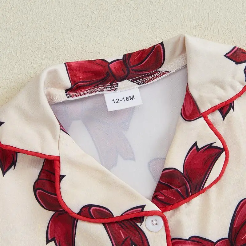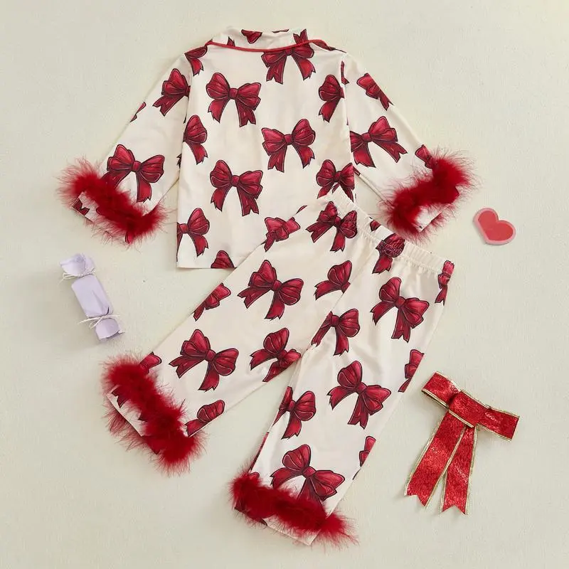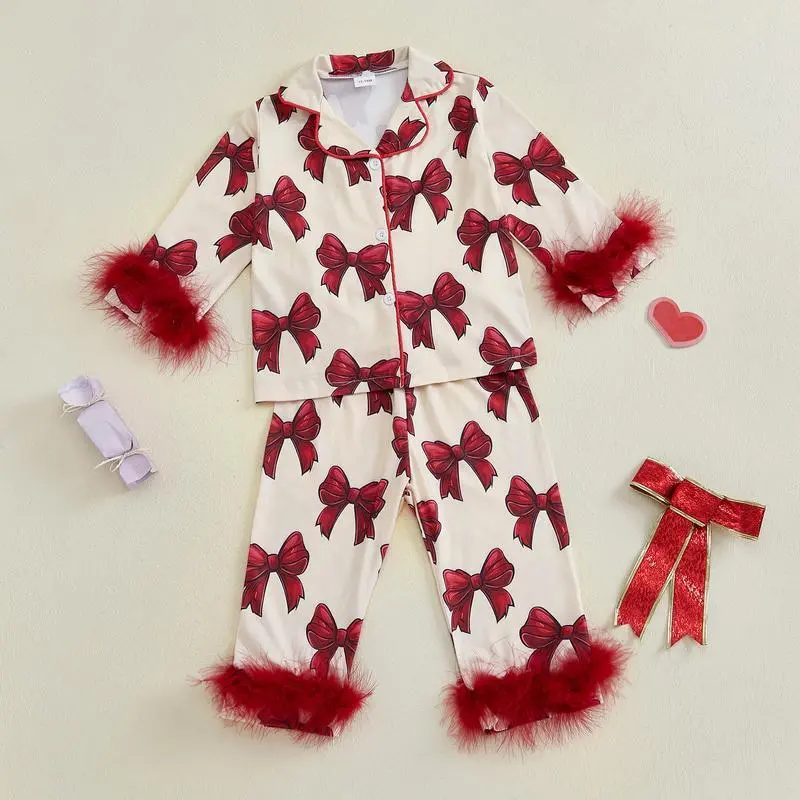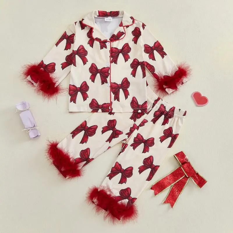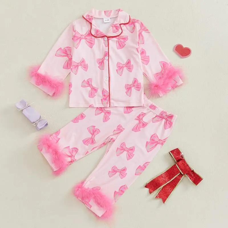 Toddler Girl Button Down Pajamas Set Cute Bow Print Feather Trim Long Sleeve Sleep Shirt + Pants Set Girls Fall PjsGift