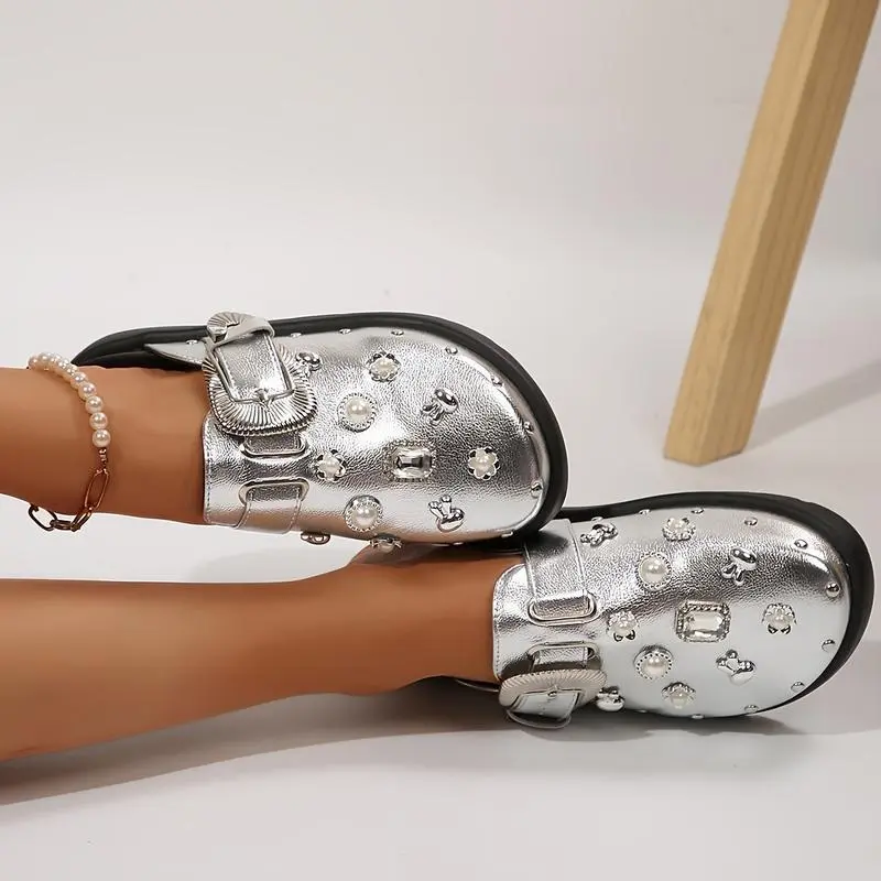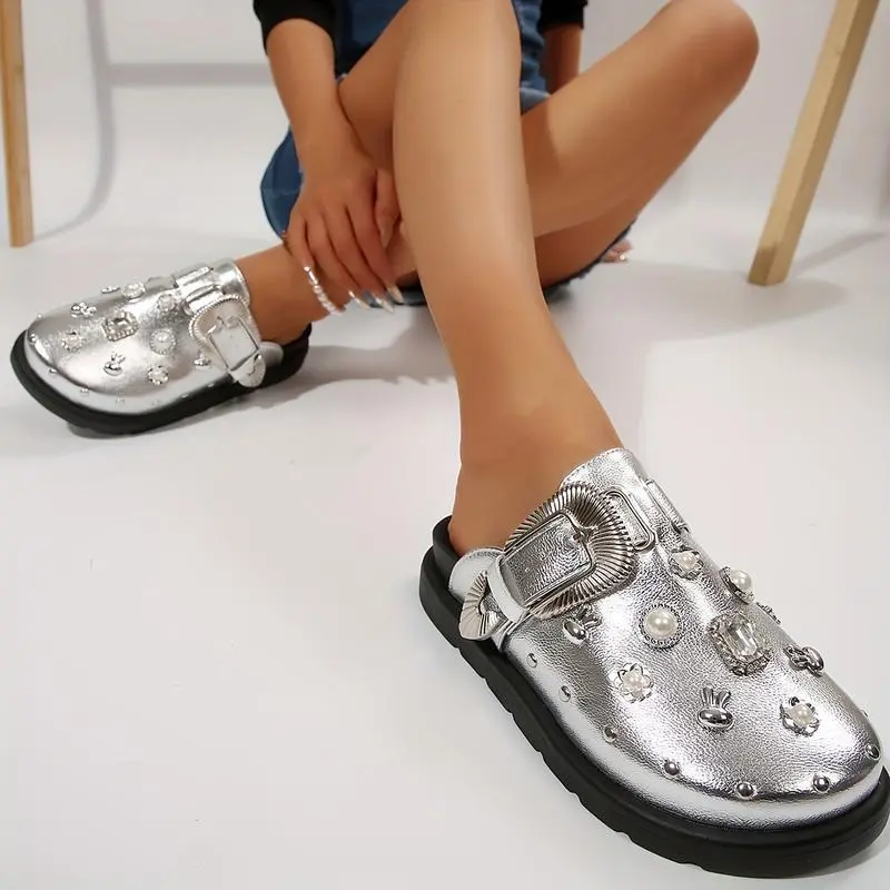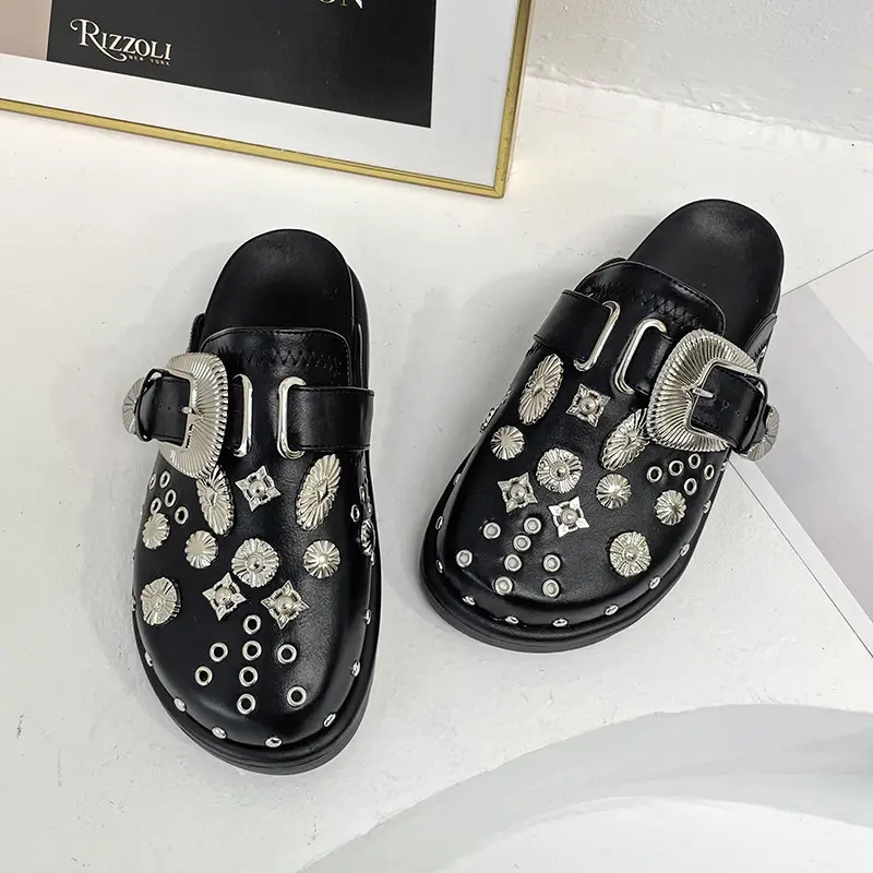 Women's Retro British-Inspired Platform Mules with Rivet Details Step into style with these women's retro British-inspired platform mules. Designed for a chic and fashionable look, these shoes feature: Embrace a blend of elegance and practicality with these retro-inspired platform mules.