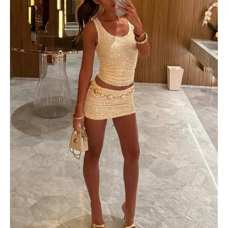 Women 2pcs Set Sequin Sleeveless Tank tops With Mini SkirtGift