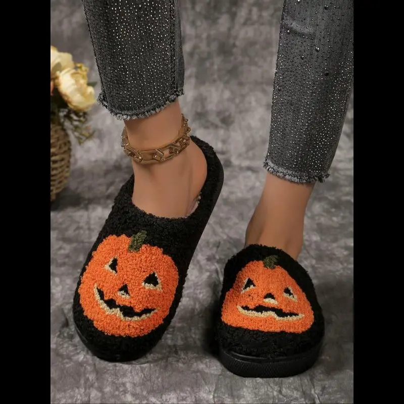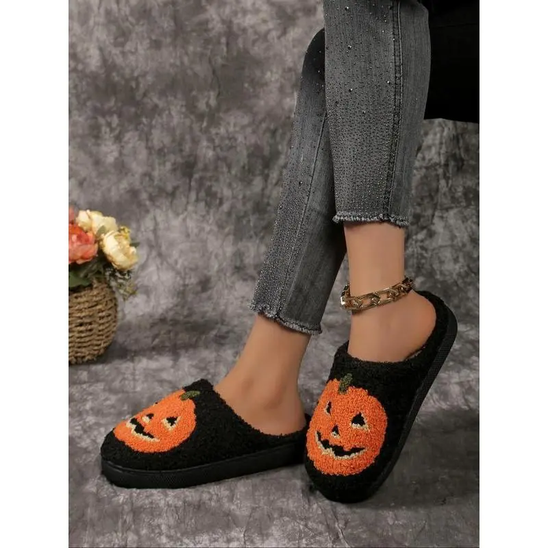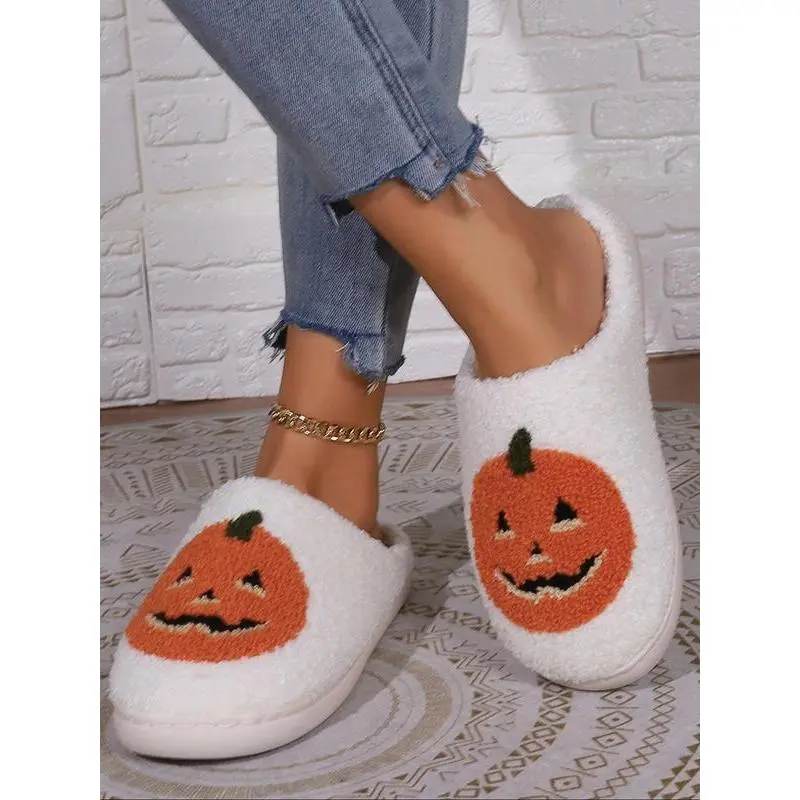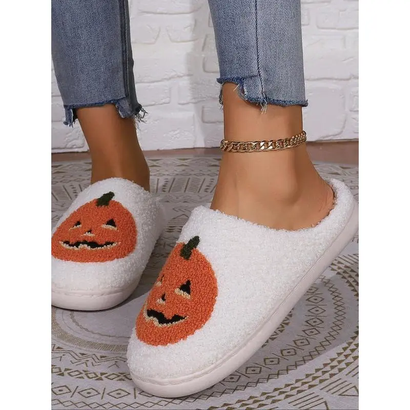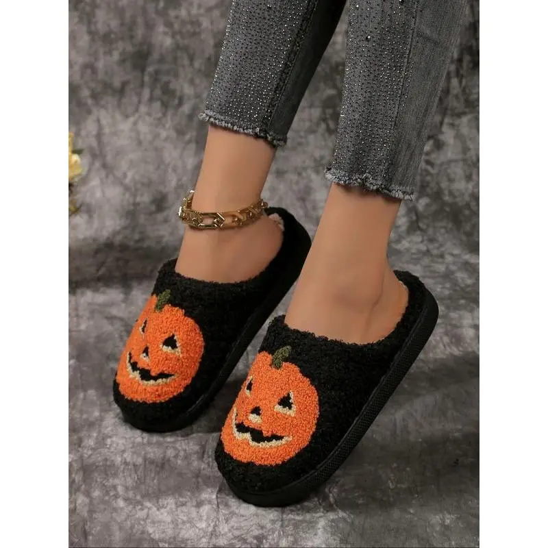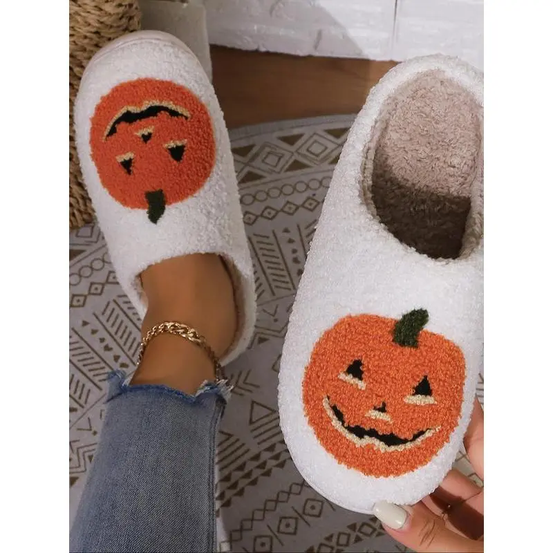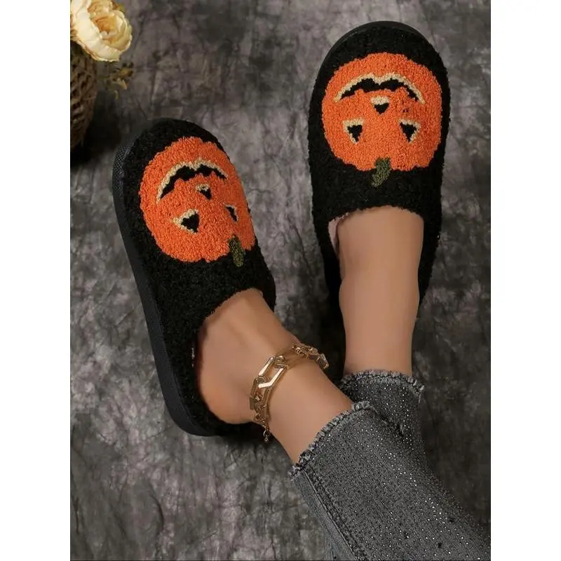 Women's Cute Cartoon Pumpkin Design Plush Slippers, Halloween Themed House Slippers, Casual Soft Comfortable Home Slippers, Warm Slippers for Indoor & Outdoor Use for Fall & Winter