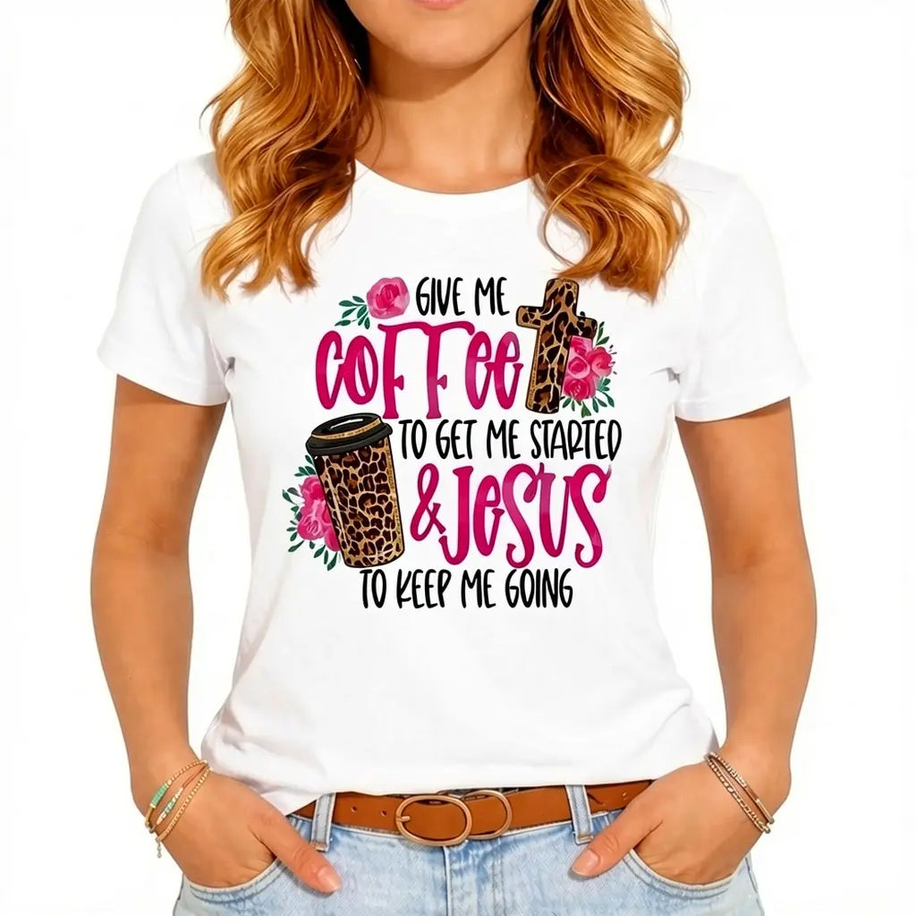 Women's Funny Coffee & Faith Graphic Tee - “Coffee & Jesus” Pink Print on Black, Loose Fit Lightweight Top for Everyday Wear, Brunch & Relaxed Weekends | Soft Casual Essential