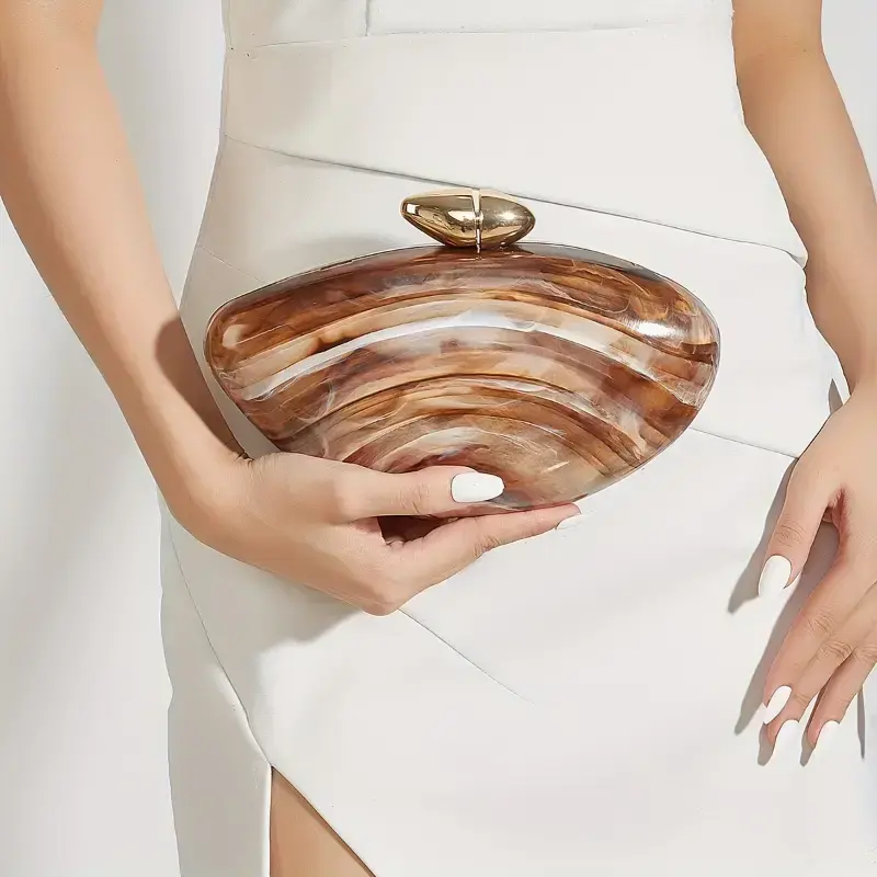 Elegant Marble Print Clutch with Magnetic Closure & Detachable Chain Strap Stylish Vintage Evening Bag for Women in Beige & Golden Accents Round Victorian Puzzle Purse