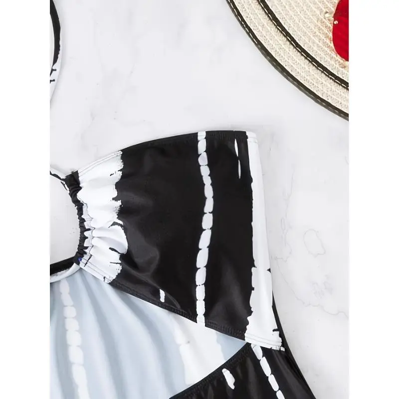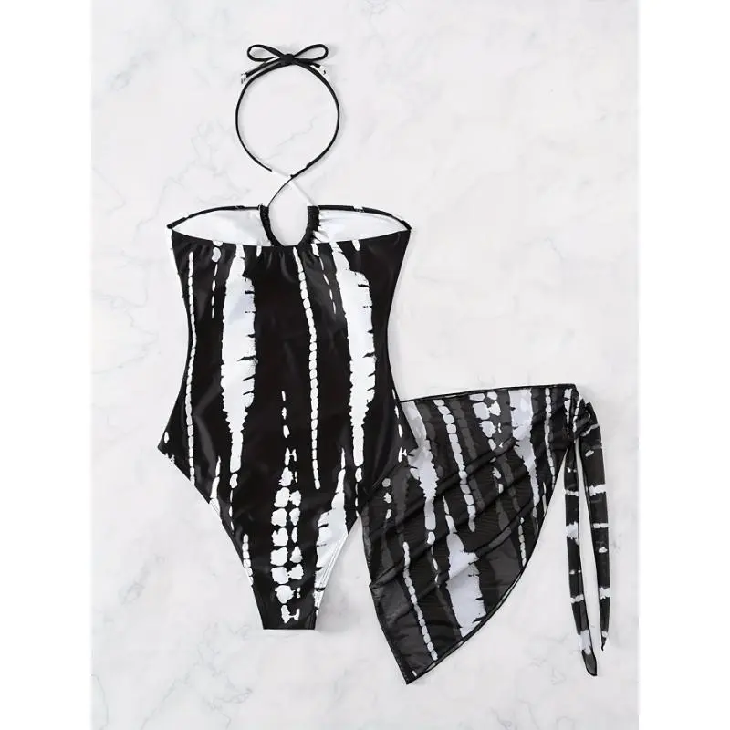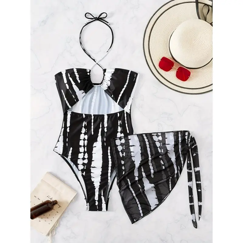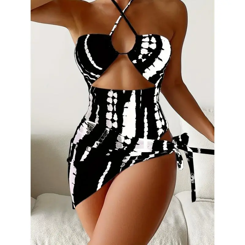 AlloverPrintTrendyHighStretch2PieceSwimsuits,CrissCrossHalterCutOutOne-pieceBathing-suit&CoverUpSkirt-Polyester-ForWomen-PerfectForBeachVacations&PoolParties-IdealGiftForSummerTrianglSwimwear