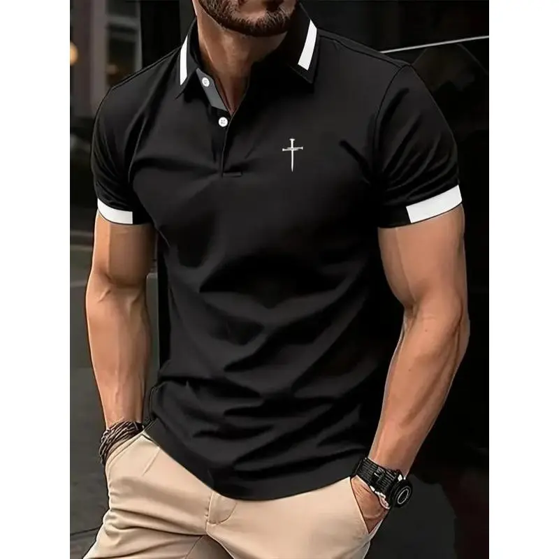 Men's Regular Fit Cross Print Button Front Polo Shirt, Casual Short Sleeve Polo Top for Summer, Fashion Men's Clothes for Daily Wear