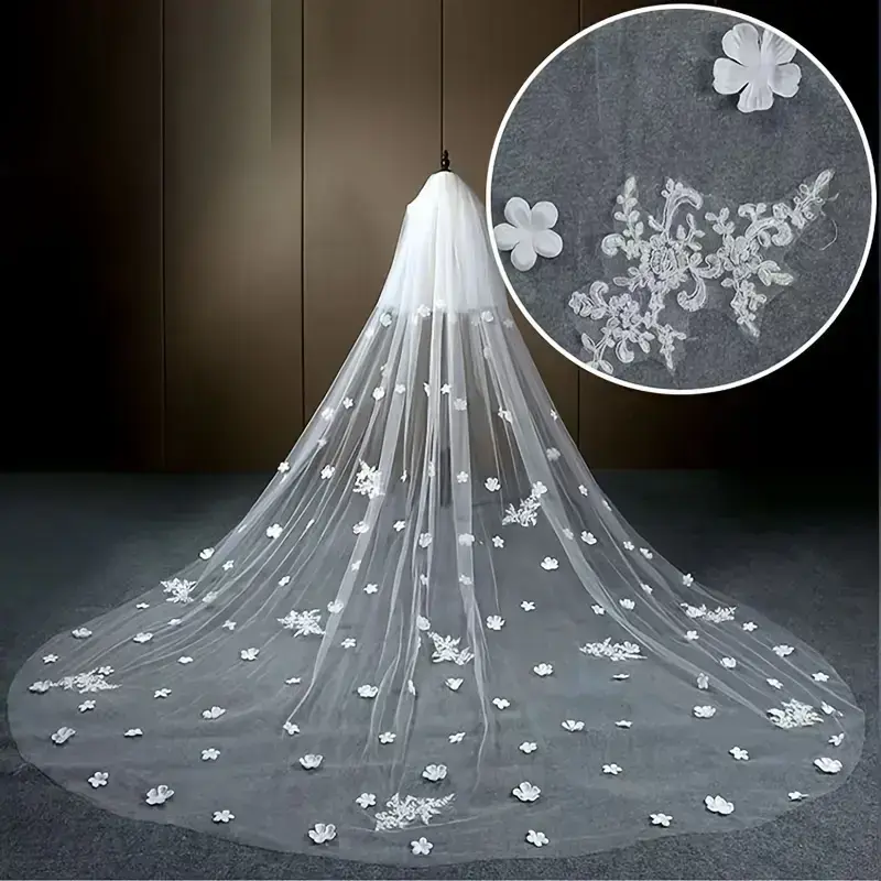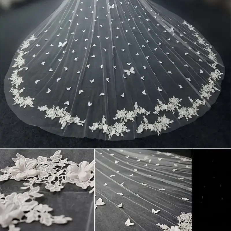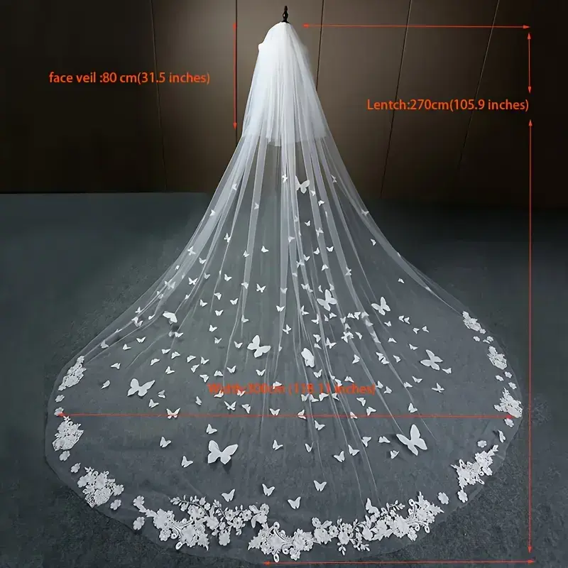 Elegant Animal-Themed Bridal Veil with Comb, Fashion Double Layer Cathedral Length 137.8inch, Soft Yarn Polyester with Positioning Lace Butterfly Print