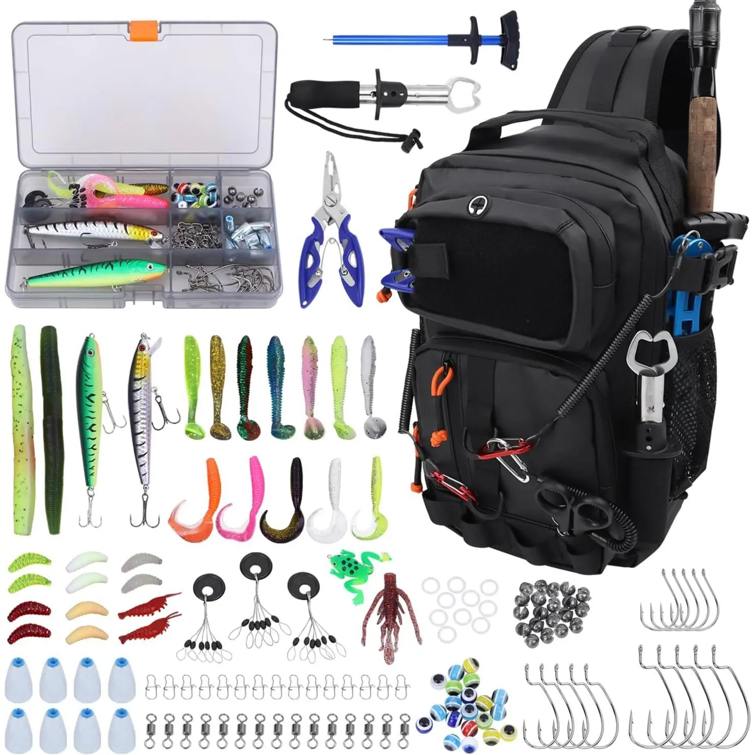 Fishing Backpack with Tackle Boxes,Waterproof Fishing Shoulder Bag for Fishing Gear,Fish Bag with 136 Pcs Fishing Lures Kit,Fish Hook Remover Tool,Fish Lip Gripper,Fishing Plier,Gifts for Men (Green)