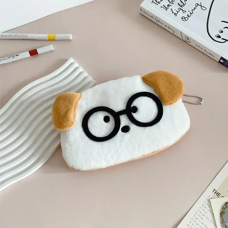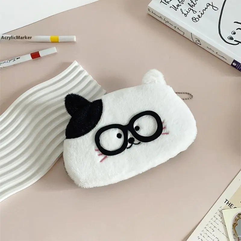 Cute Glasses Puppy Kitten Plush Pencil Case Large Capacity Pencil Bag Student Stationery Storage Bag Small Wallet Birthday Gifts