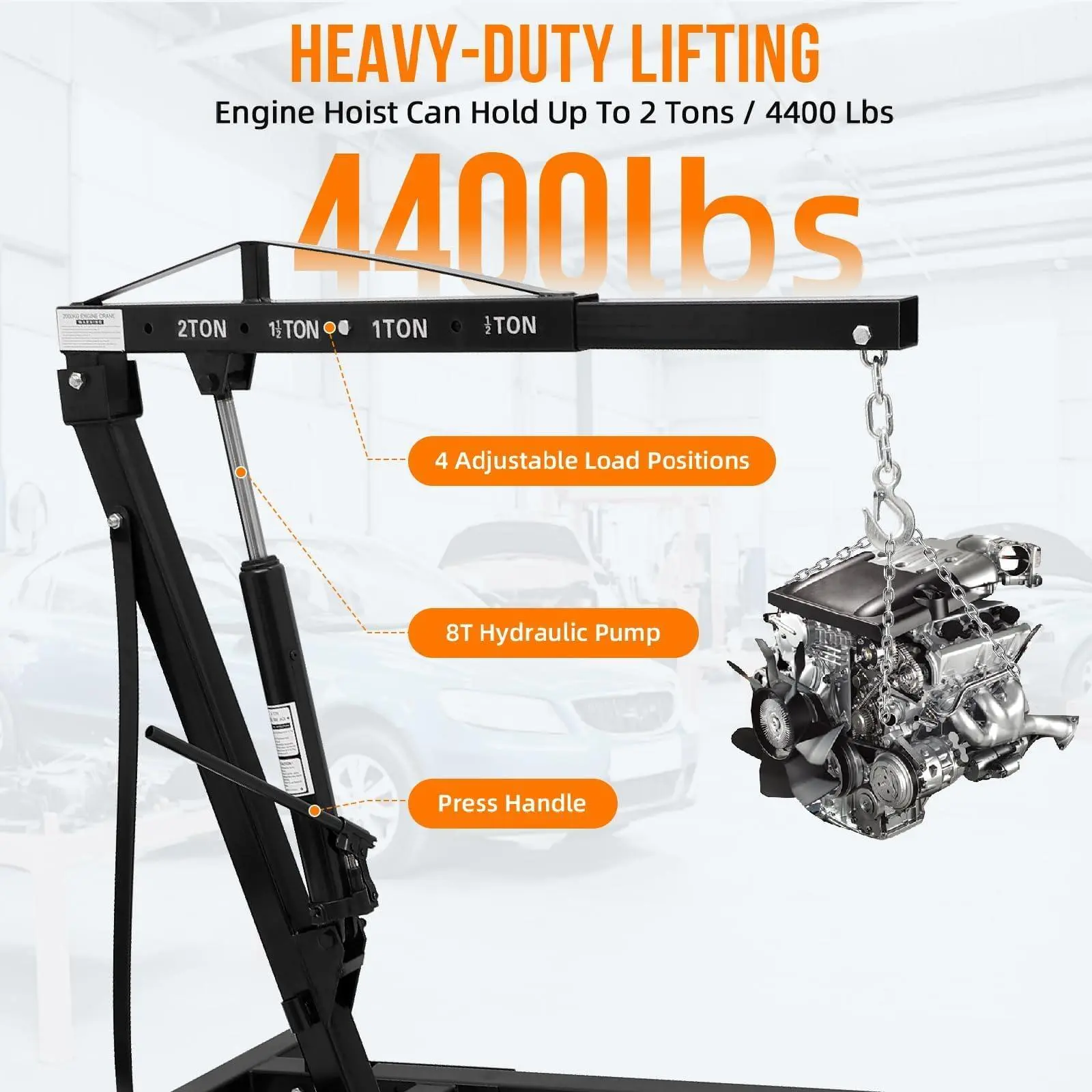 Heavy-Duty Engine Crane: This engine hoist can support up to 2 tons/4400 pounds, making it ideal for lifting car or truck engines during maintenance and construction, as well as unloading heavy cargo.